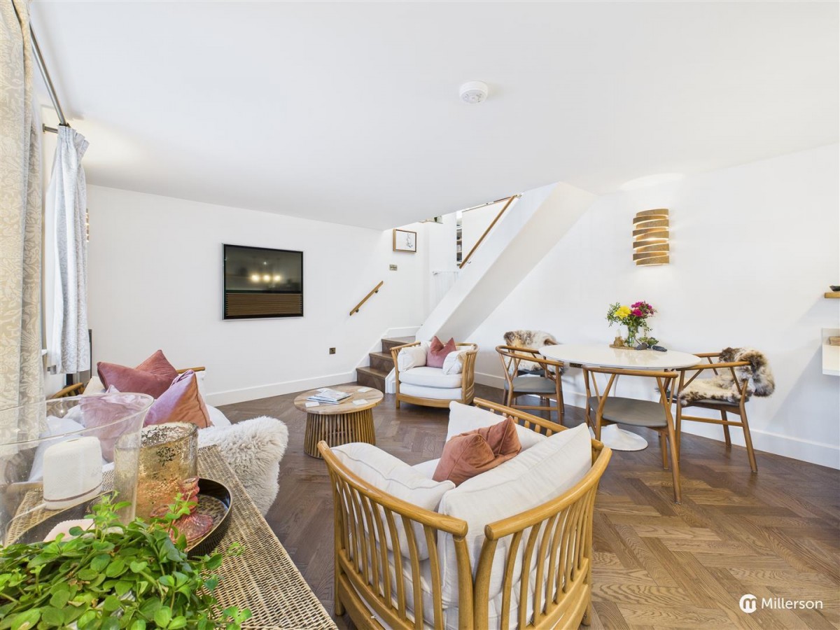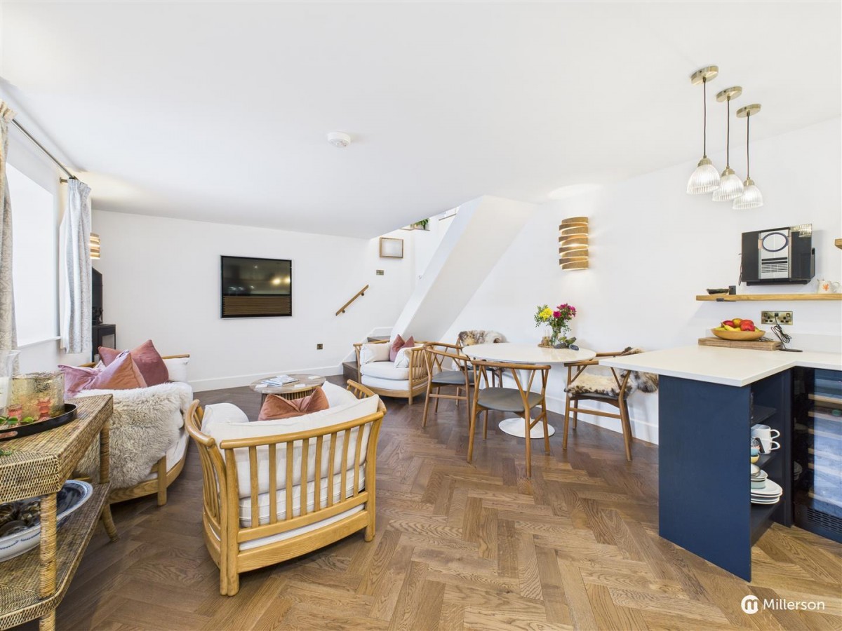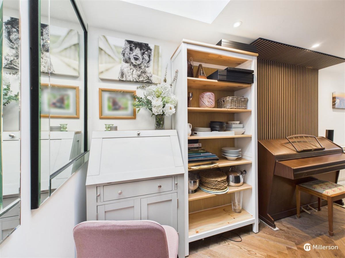 Space for a Smeg Freestanding range style cooker (available via separate negotiation). Stainless steel splash back, and stainless steel extractor with integrated lights above. Fitted wooden shelving. Integrated wine cooler fridge, Bosch integrated fridge and dishwasher, attractive oak engineered, herringbone flooring, double glazed window to the front with deep window cill.