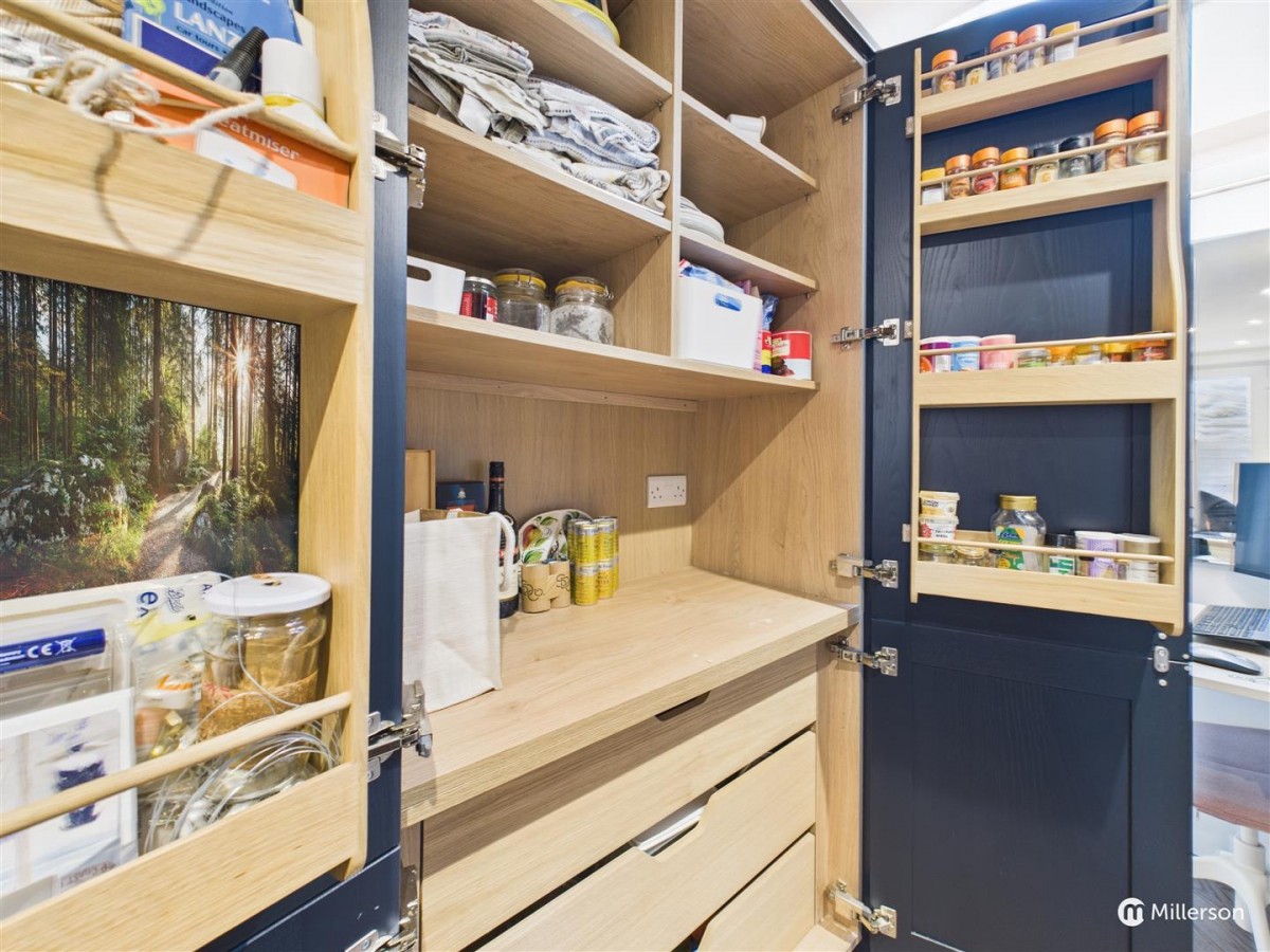 Oak engineered flooring, electric radiator, double glazed door to the side. Space for washing machine, and tumble drier, two fitted shelves, integrated AEG fridge freezer, and a useful built in larder cupboard.