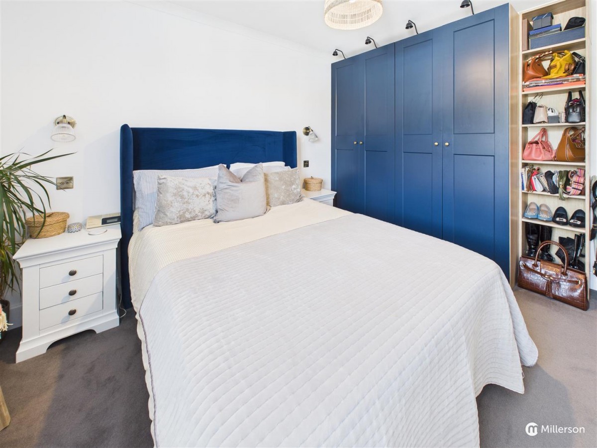 Fitted wool carpet, double glazed window to the front, two wall lights, loft access, built in wardrobes with LED lighting above, and shelving unit to the side.