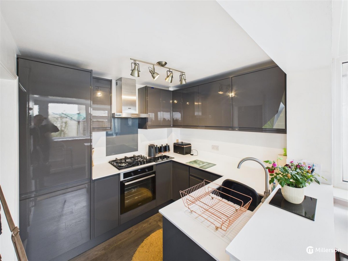 Attractively fitted with a range of modern, high gloss base and wall mounted kitchen units with contrasting work surfacing over.