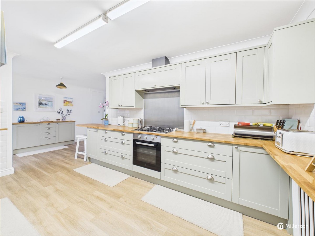 KITCHEN-Attractively fitted with a range of shaker style base and wall mounted kitchen units with oak block work surface over. One and a half bowl sink and drainer with tiled splash back, space for dishwasher, five ring gas hob with stainless steel splash back, oven below, laminate flooring, radiator, double glazed window to the front, breakfast bar and space for a freestanding fridge freezer.