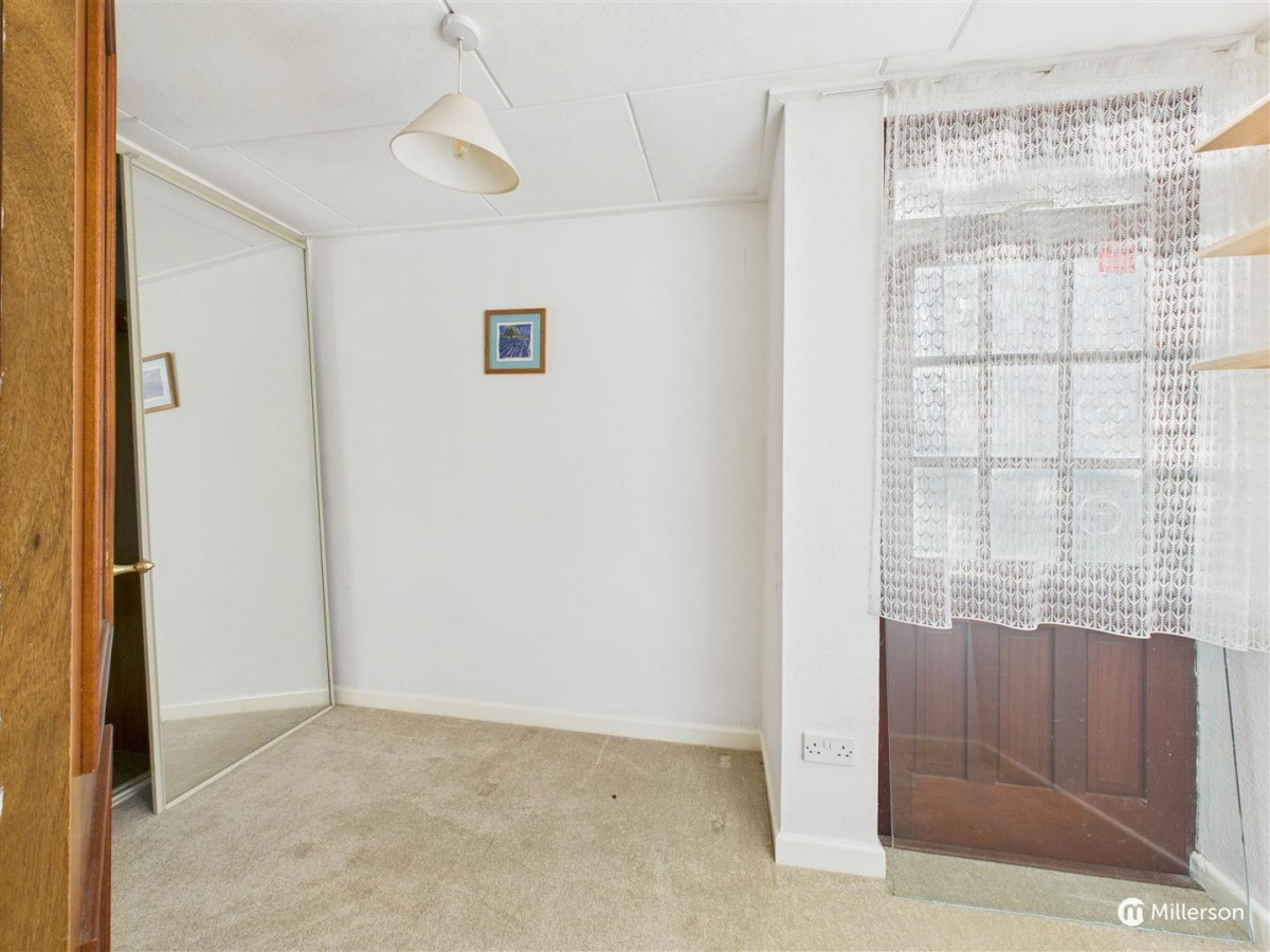 Fitted carpet, fitted shelving, door to front (no longer in use) recess with fitted shelving and hanging rail, radiator.