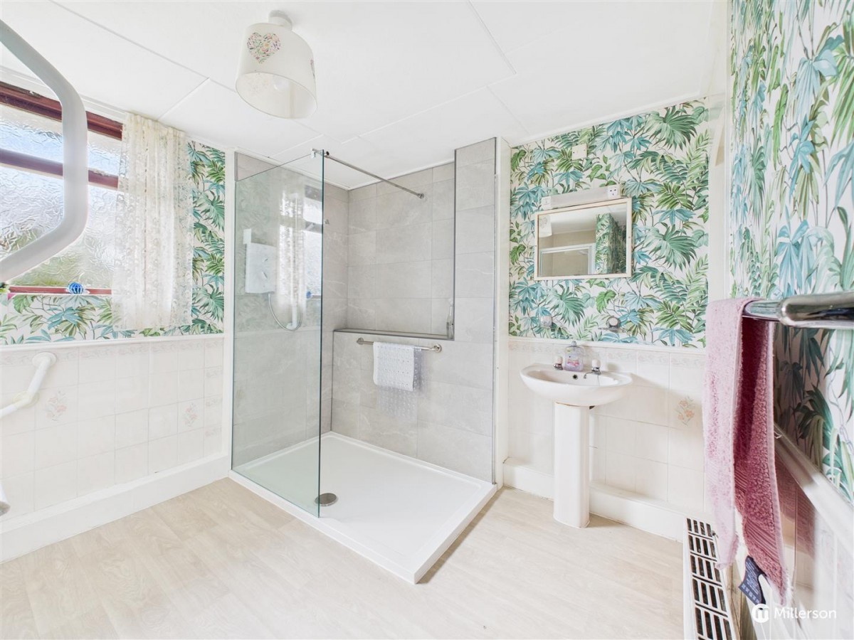 Large walk in shower cubicle with electric shower, tiled walls, shower screen, hand rail to the side. Vinyl flooring, low level w/c, second shower cubicle with electric shower, tiled surround.
