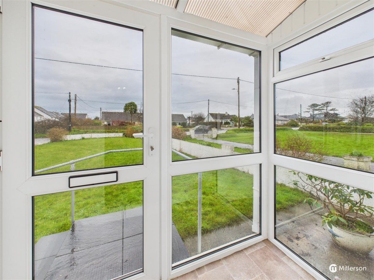 Tile effect vinyl flooring, double glazed windows to three sides, sloping polycarbonate roof, double glazed door to the rear.