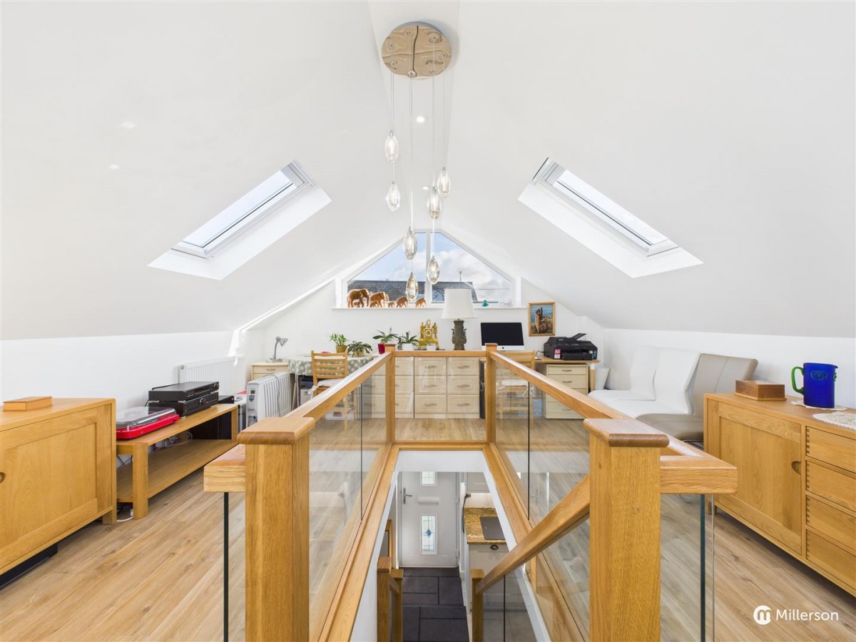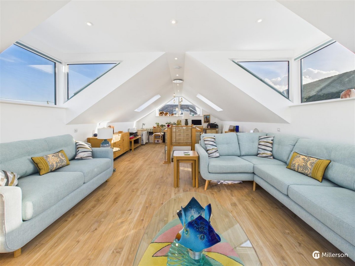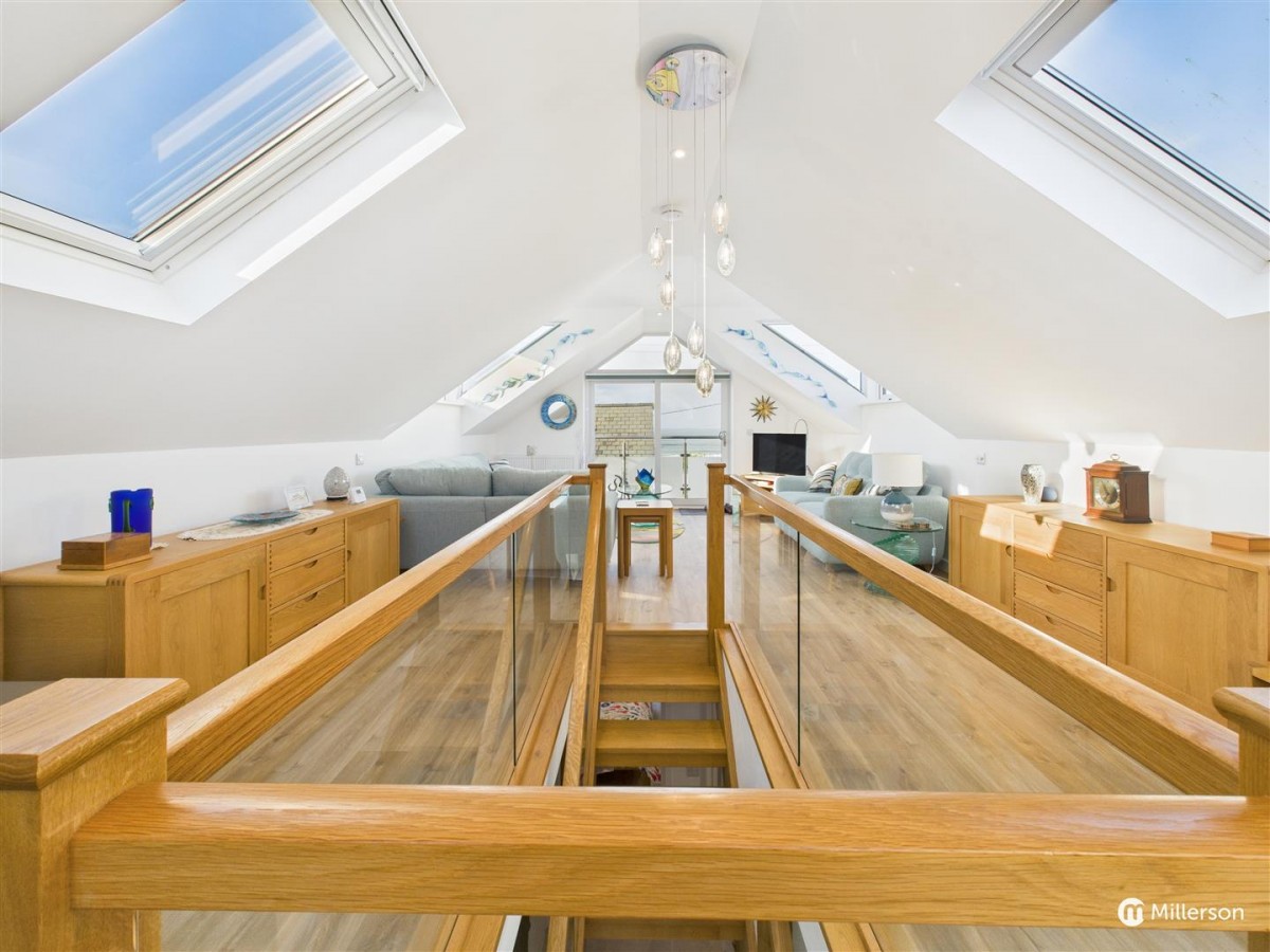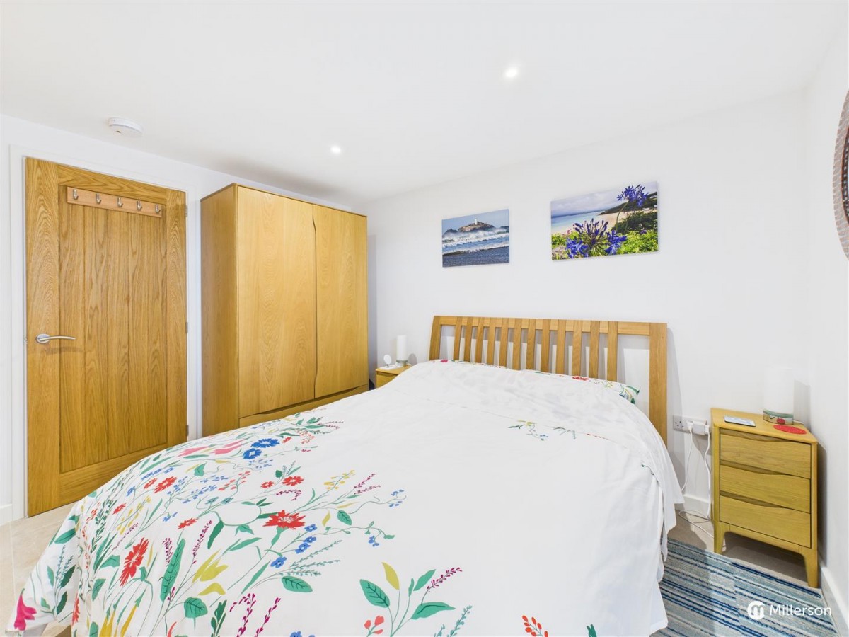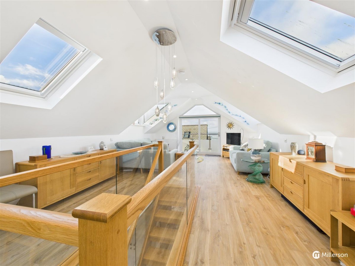 Laminate wood effect flooring, two heating radiators, glass surround over staircase with oak hand rail. vaulted ceiling with inset ceiling spotlights, triple glazed window to the front, two triple glazed Velux roof lights. Two dormer windows to the side offering views across to Godrevy Lighthouse, triple glazed sliding patio doors enjoying stunning sea views and leading onto rear balcony.