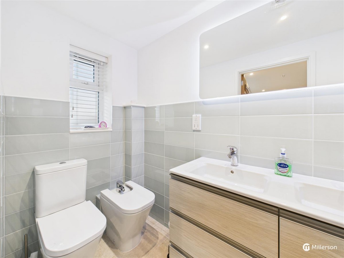 Low level w/c with push button flush, bidet, obscured triple glazed window to the rear, inset ceiling spotlights, electric heated towel rail.