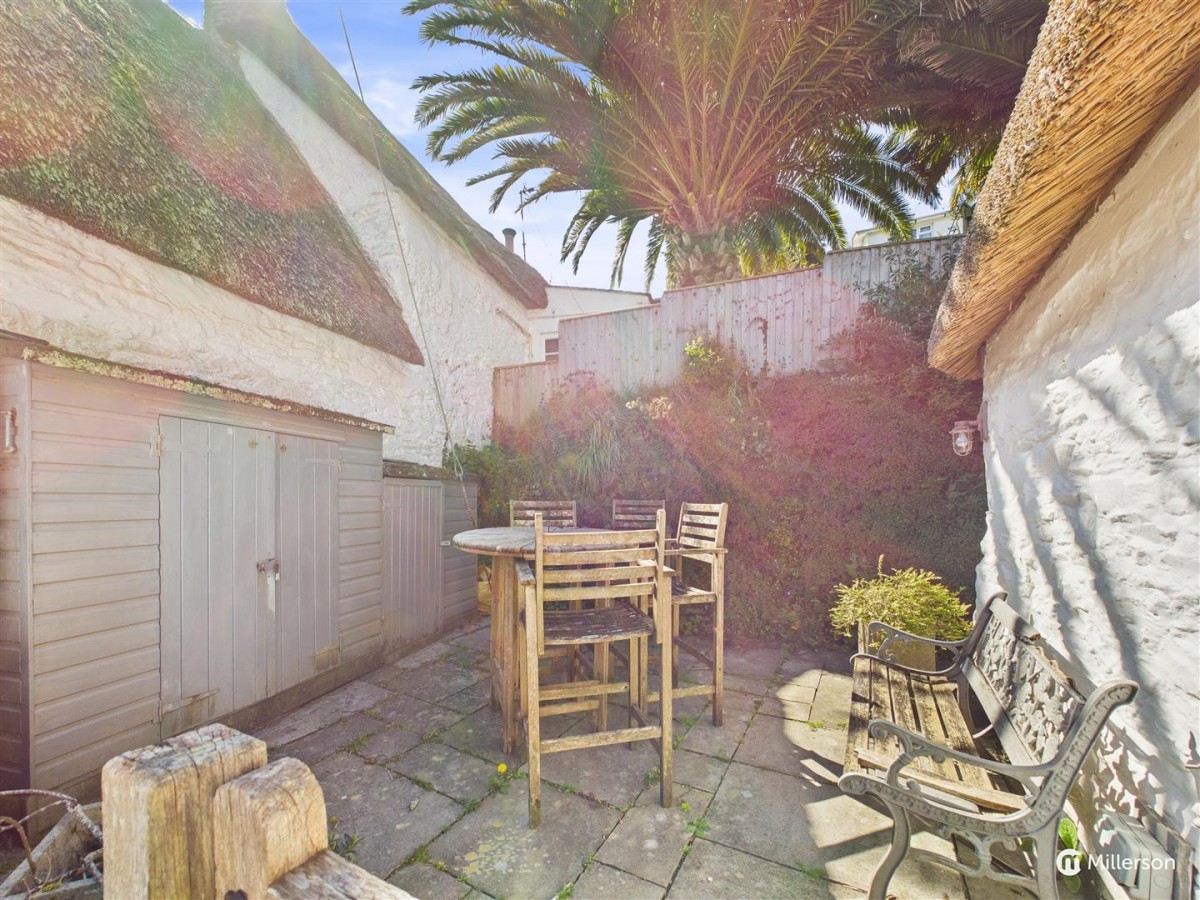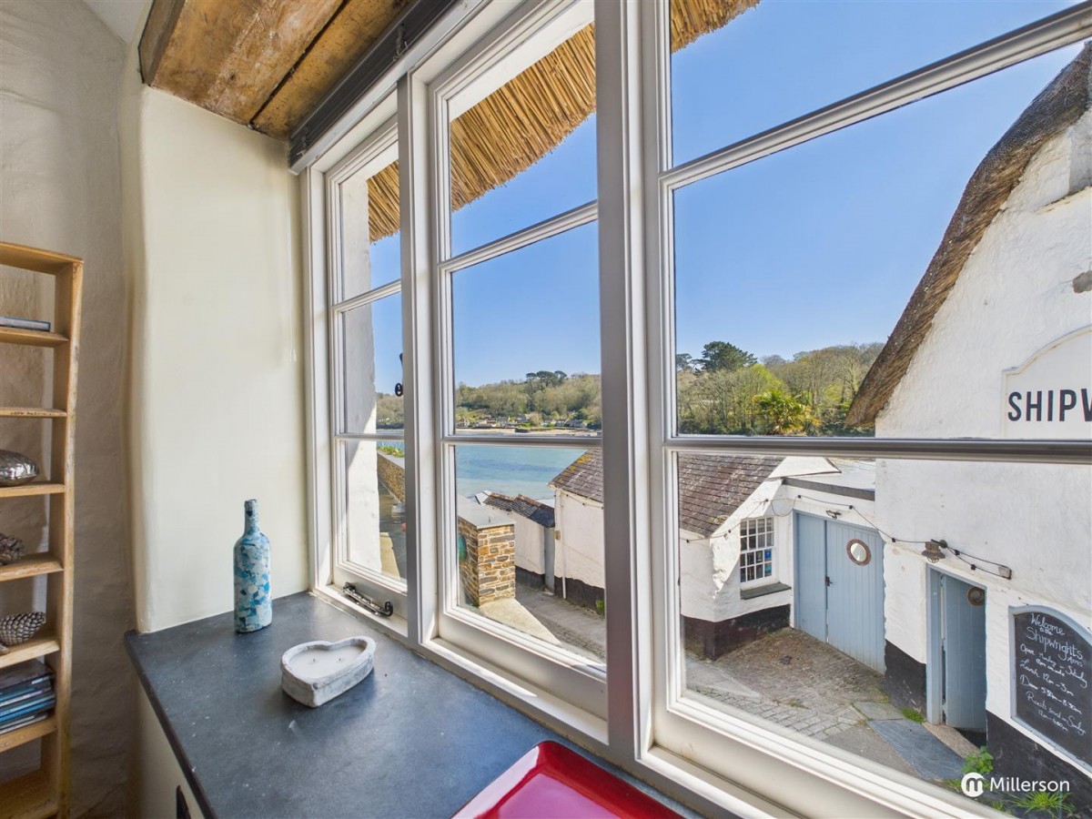 Outside, the part thatched roof, sash style windows and white washed walls give this charming cottage a wonderful first impression and has the enjoyment of an enclosed patio area with views towards the water, perfect for alfresco dining. There is also the huge benefit of an allocated parking space just a short walk beyond the property.