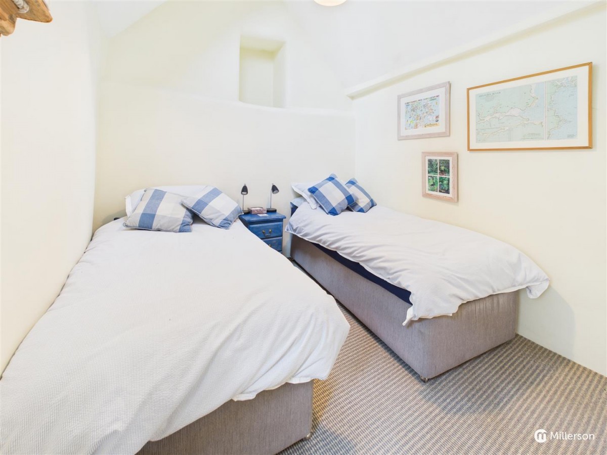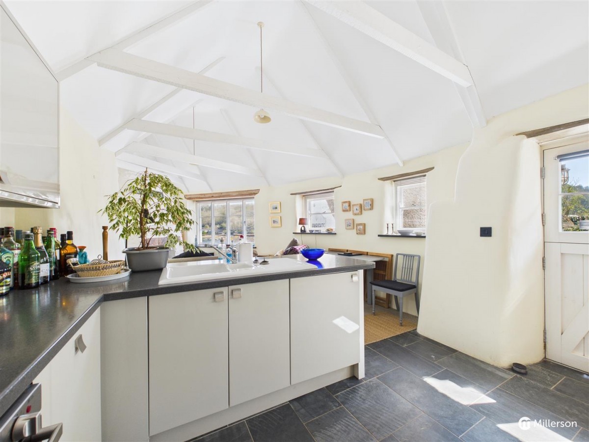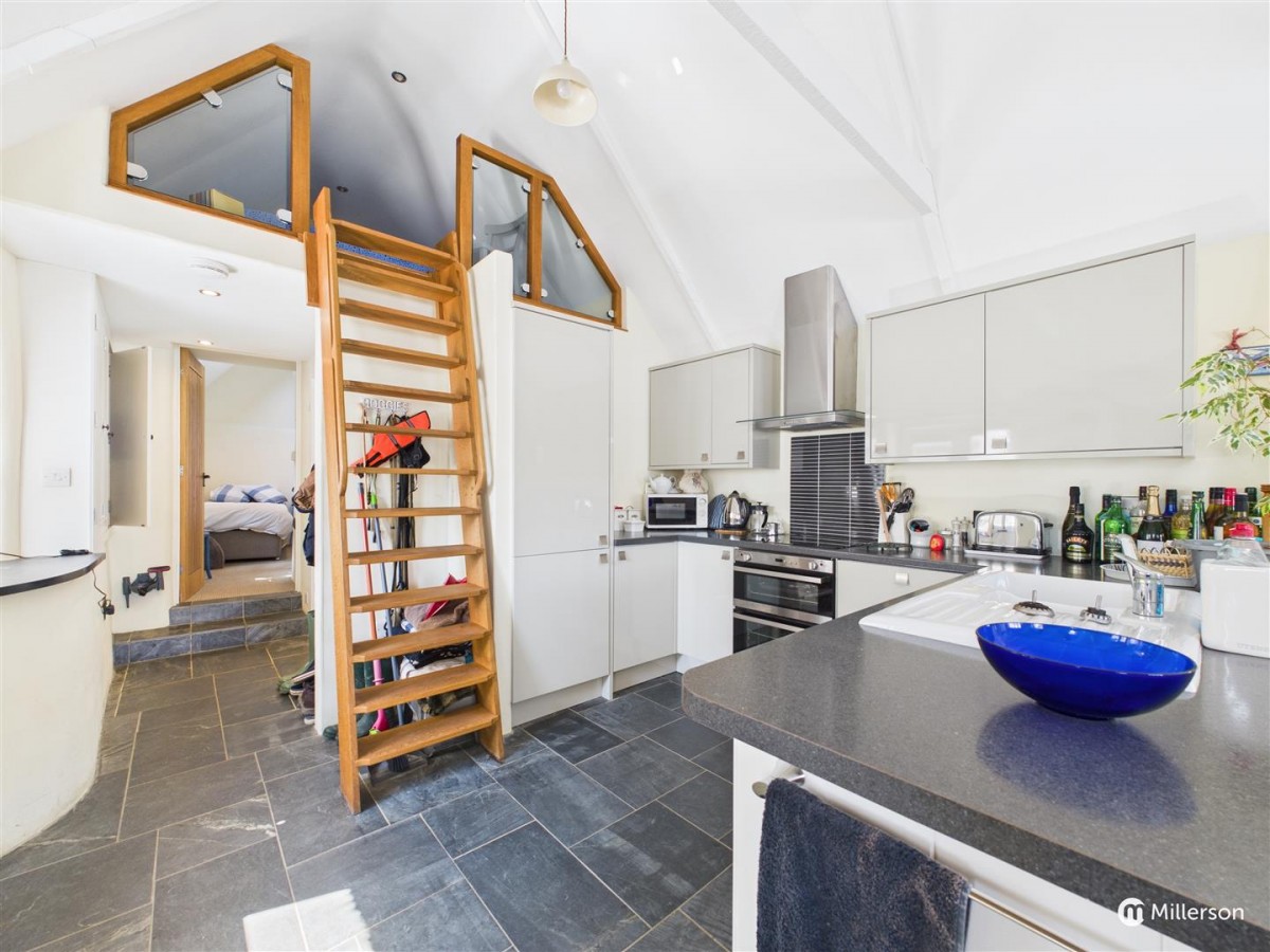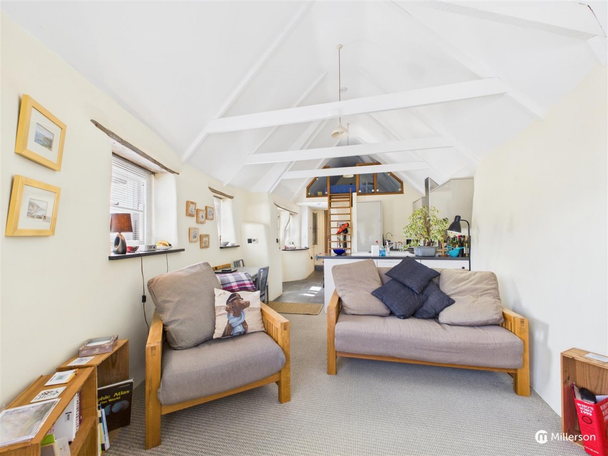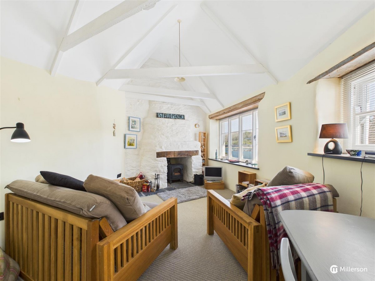A stunning open plan living space with delineated kitchen, dining and seating areas. The kitchen is fitted with a range of base and wall units, integrated appliances including fridge & freezer, washing machine, 4 ring ceramic hob, double electric oven with grill, dishwasher, one and a half bowl single drainer sink unit, roll edge worktops, stainless steel extractor hood, natural slate floor, exposed 'A' frames, oak ladder giving access to the Mezzanine Bedroom, dining space and a cosy lounge area with wood burner and flagstone hearth, stunning views of the creek from its three windows with slate sills and wooden lintels.