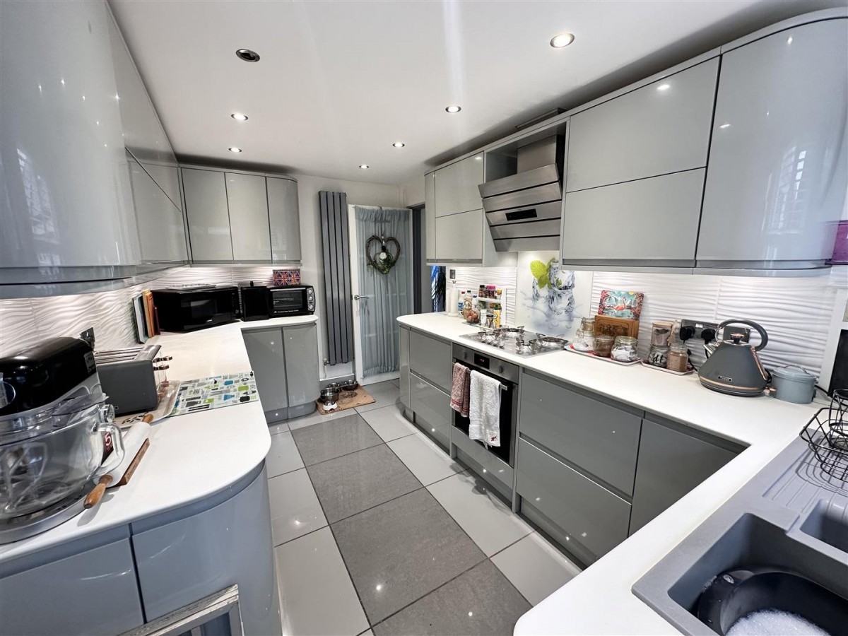 Work top surface incorporating a sink unit with drainer and spring mixer tap over. There are cupboards under, a broom cupboard and space for a dishwasher, tumble dryer, fridge/freezer and freezer. Plumbing for washing machine. Spotlighting. electric cupboard with consumer unit and timer for the outside light.Tiled floor and a frosted window to the side. Door to: