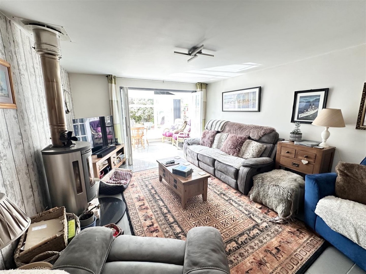 A dual aspect room with outlook over the patio and front garden. Blue tinted, self cleaning glass roof/window blinds. Tiled floor, door to kitchen and folding doors to: