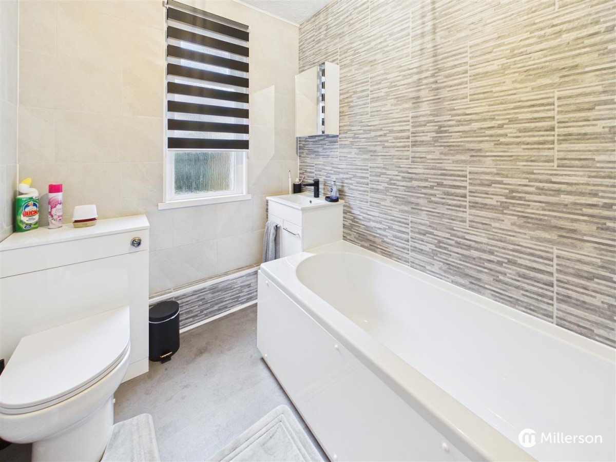 A modern and recently installed new Suite comprising of panelled bath with mixer taps over. Low-level WC. Inset wash hand basin with cupboard unit beneath. Wall mounted mirrored medicine cabinet. Modern tiling to all four walls. UPVC double obscured window to side elevation. Radiator.