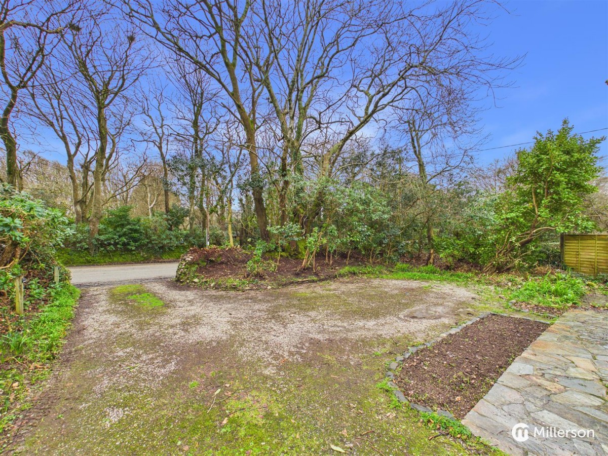 the entrance opens up into a Generous driveway with parking for numerous vehicles. The stone chipped driveway is bordered to three sides by a range of shrubs plants trees and bushes. The driveway continues to the side of the property giving direct access to the detached single garage. This area provides further parking space. There is pedestrian access to either side of the property leading to the rear garden.