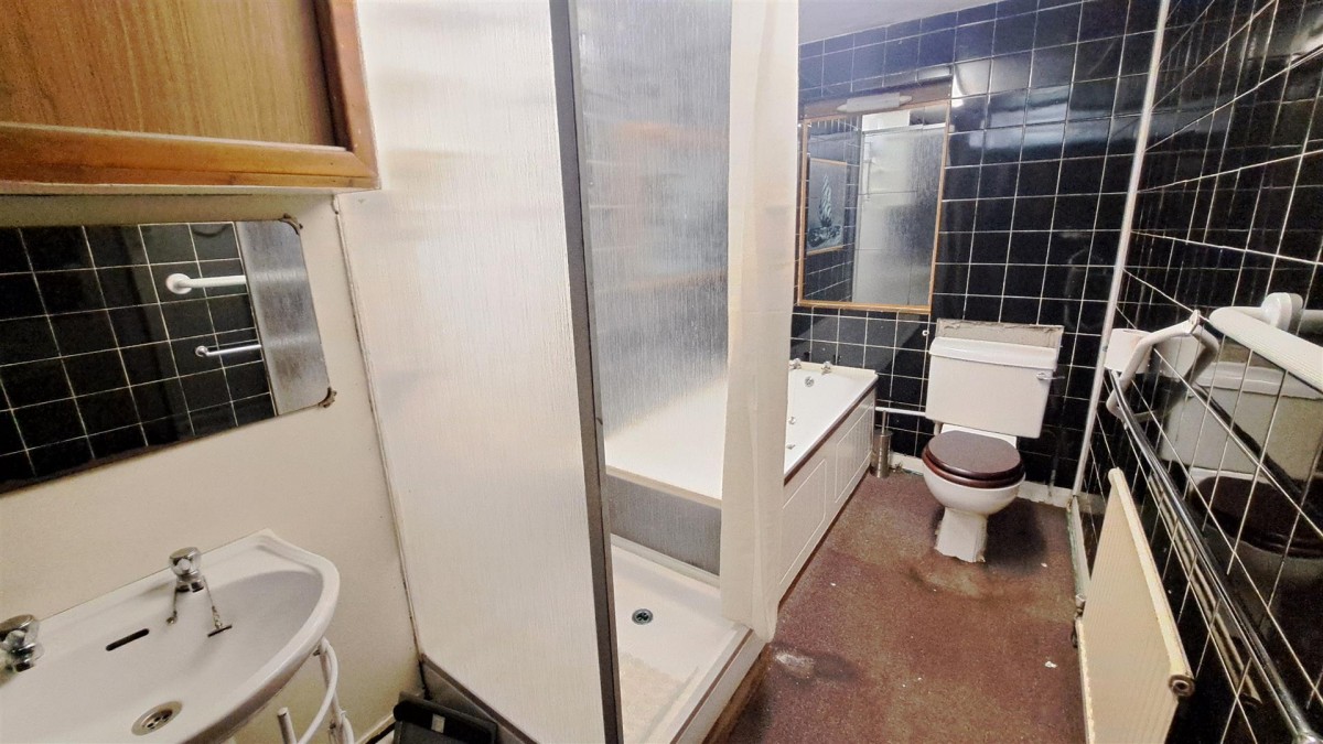 A four piece family bathroom comprising bath, shower cubicle with electric shower, W.C and hand basin, tiled walls, extractor fan, radiator.