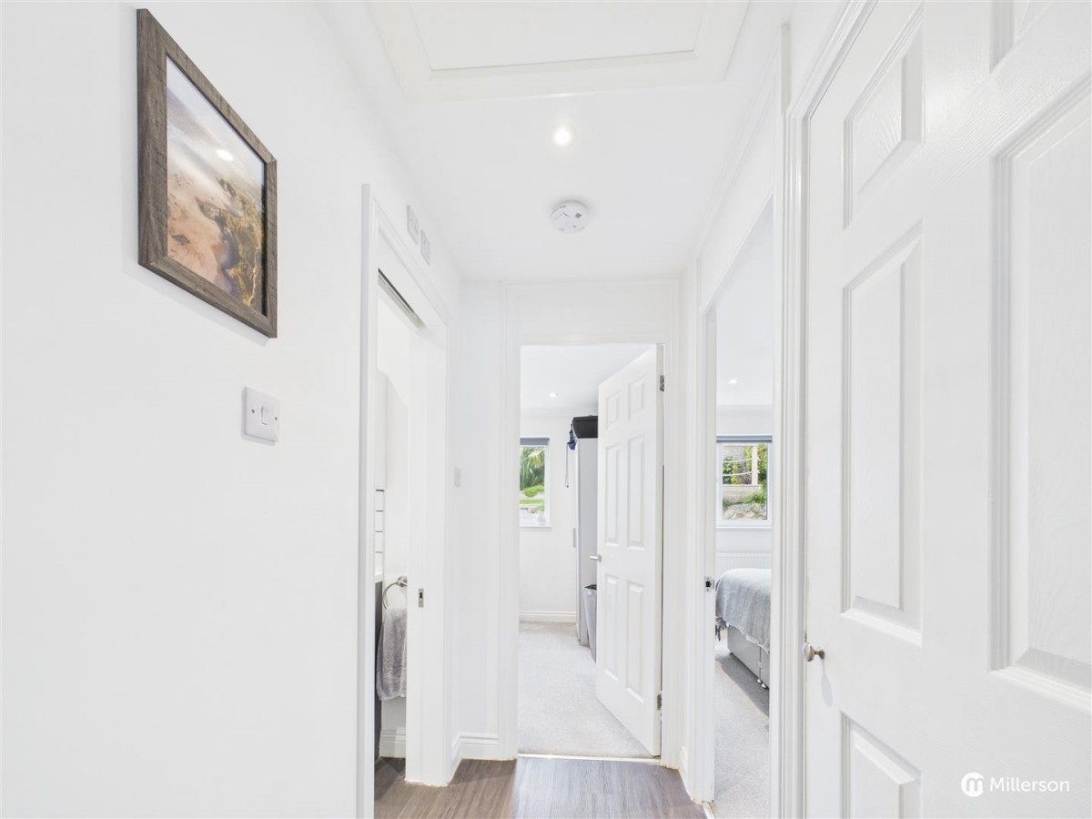 Shelved storage cupboard housing Worcester combination boiler. Loft access. Fitted carpet. Doors to bedrooms and bathroom.