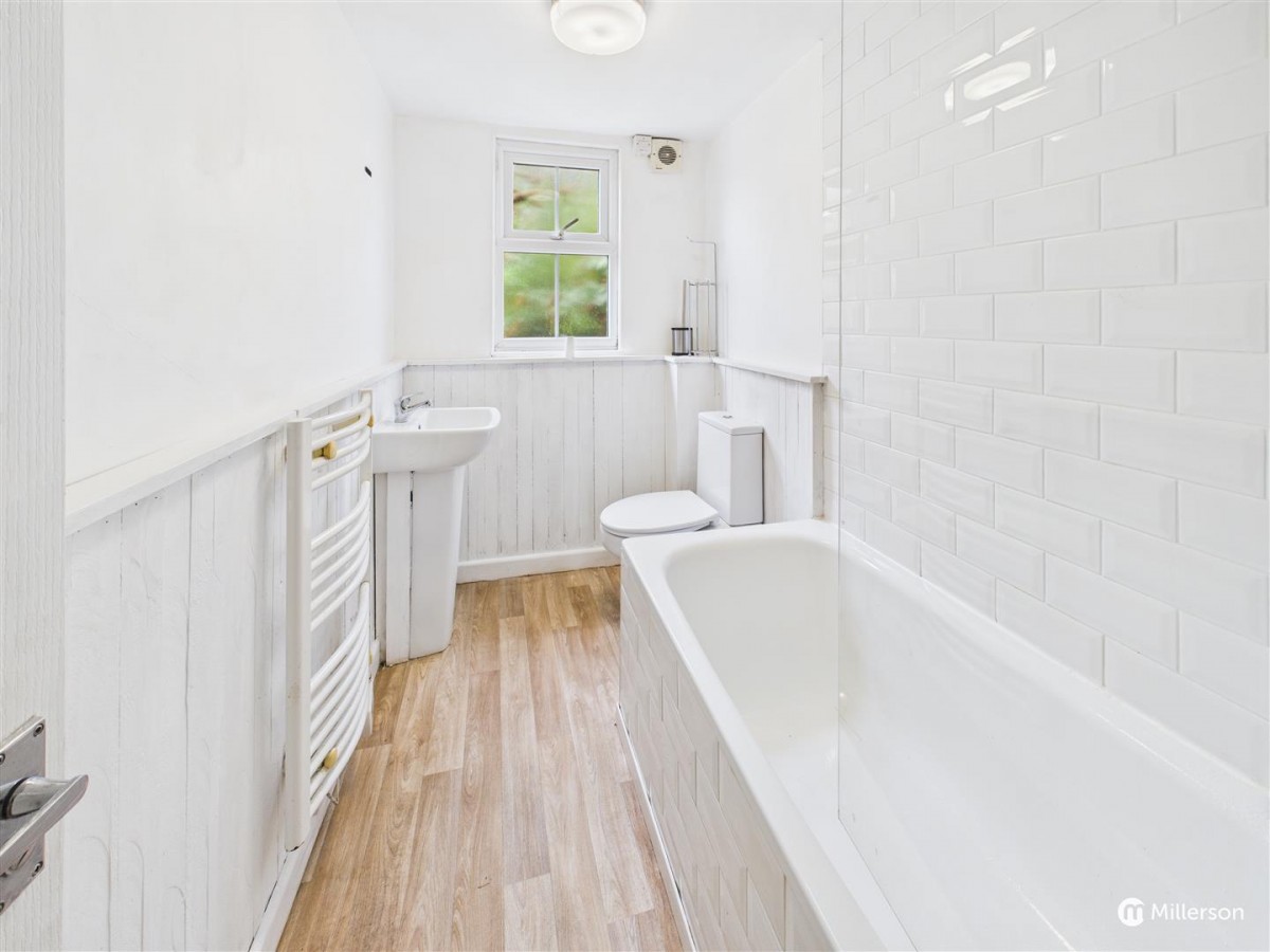 With wood panelling to Dado rail height, panelled bath with tiled panel, shower scree, electric shower over, ladder style electric towel rail, pedestal wash basin, close coupled WC, double glazed window to rear aspect, extractor fan.