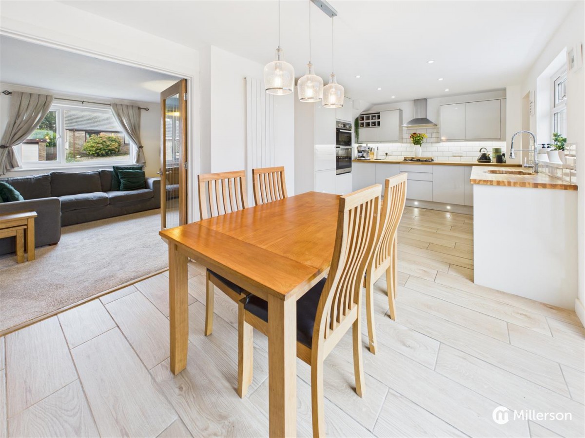 A stunning kitchen/diner which is the real hub of the house with double glazed doors opening onto the rear garden. The kitchen has been fitted with a wide range of soft closing base and wall units incorporating an integrated dishwasher, fridge, freezer, electric oven, gas hob, extractor hood, under cabinet and plinth lighting along with solid wood work surfaces, complimentary 'Metro' tiled splash backs and a one and half bow sink with mixer tap. There is also a decorative radiator, wood effect floor tiles, double glazed window and plenty of space for a dining table and chairs. An oak internal door leads into: