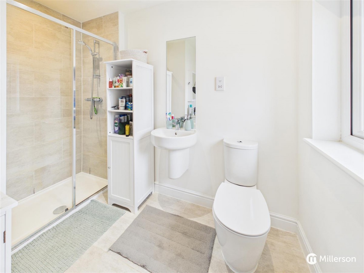 A well appointed three piece shower suite comprising shower cubicle with tiled surround, W.C and hand basin, heated towel rail, obscure double glazed window, inset lighting, extractor fan.