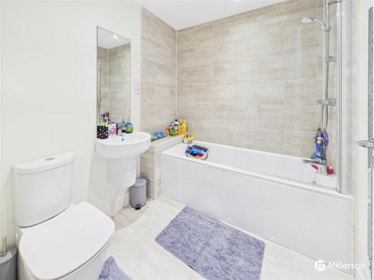 A white three piece bathroom suite comprising bath with shower over and tiled surround, W.C and hand basin, heated towel rail, inset lighting, extractor fan.