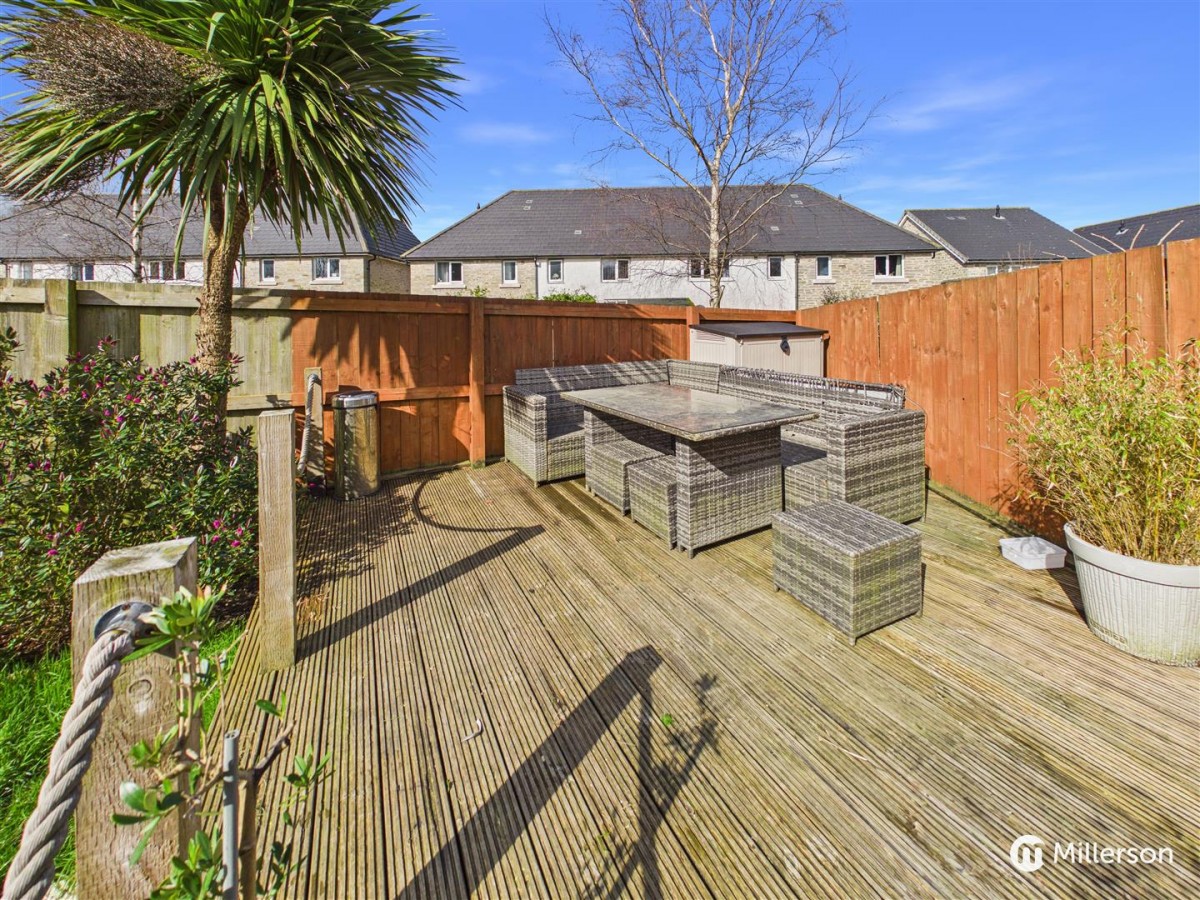 The property sits at the end of a Cul De Sac approached over a pathway from two allocated parking spaces. A side passage with pedestrian gate leads into a generous, family friendly garden, perfect for children, pets and entertaining. There is a paved patio which opens onto a level lawn leading to an additional sunny decked patio area with lighting, ideal for alfresco dining and summer evenings. A useful tool shed with power and lighting provides storage .