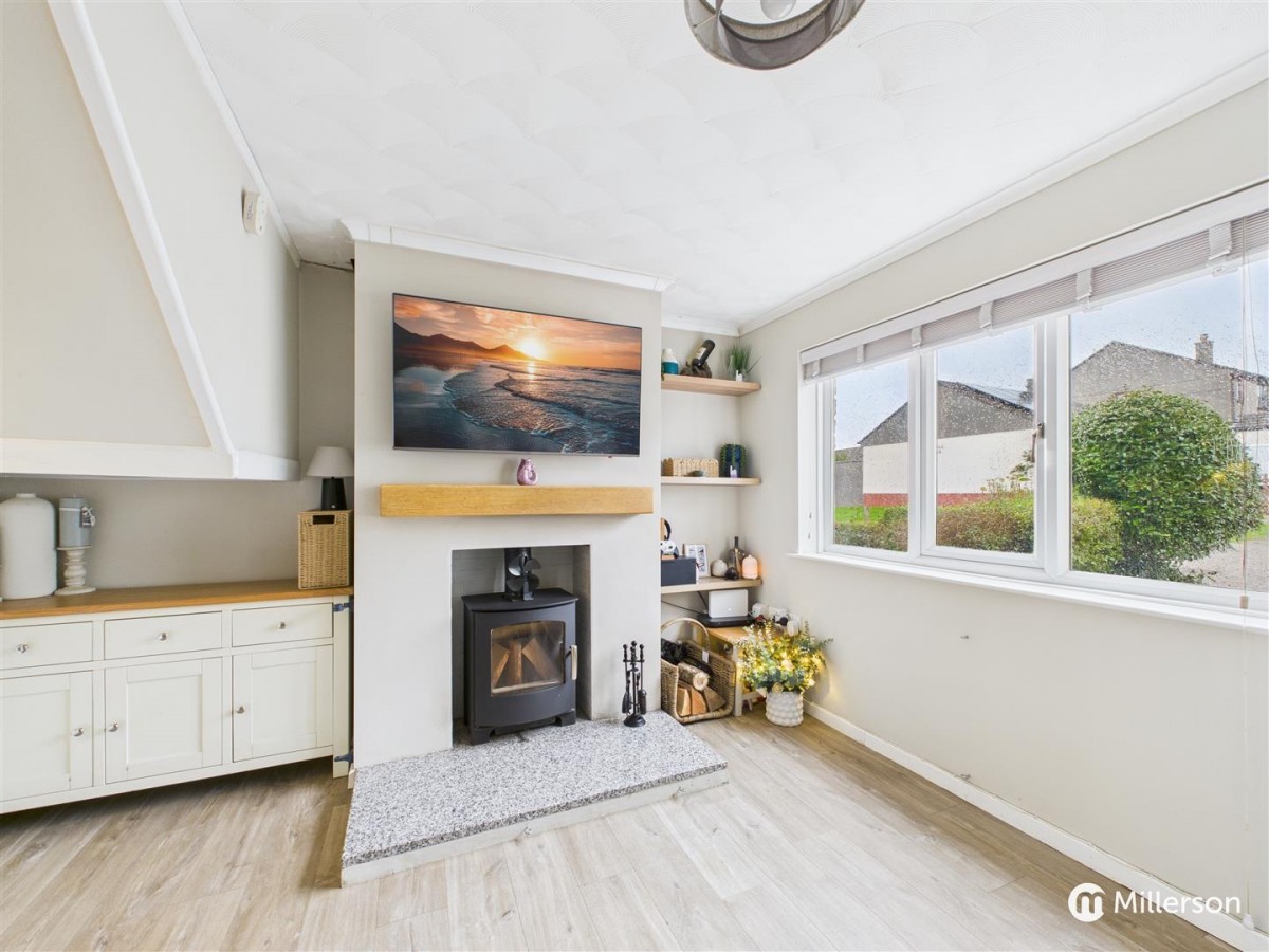 A lovely spacious room with uPVC double glazed window to front elevation. Oak effect laminate flooring. Feature wood burner. Stairs to first floor. timber glazed door opening through to: