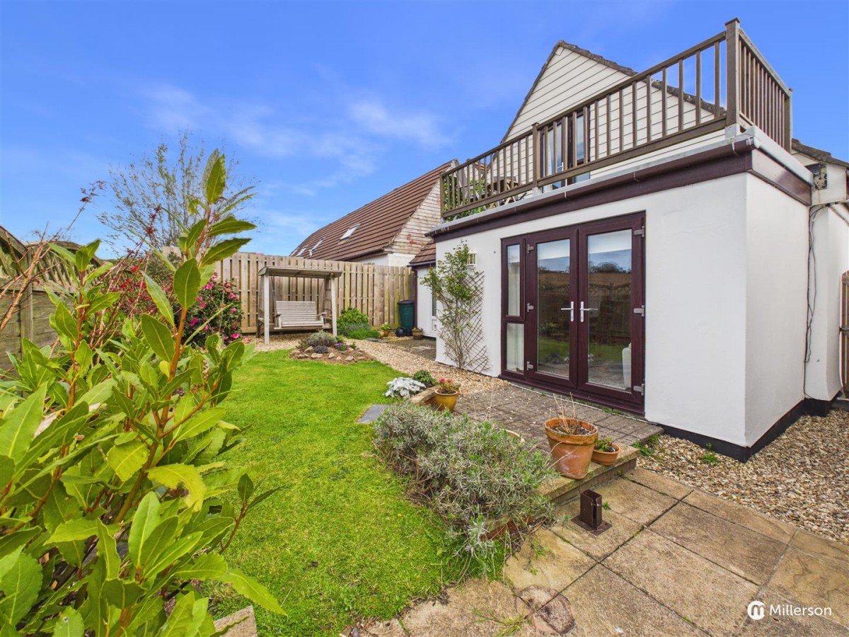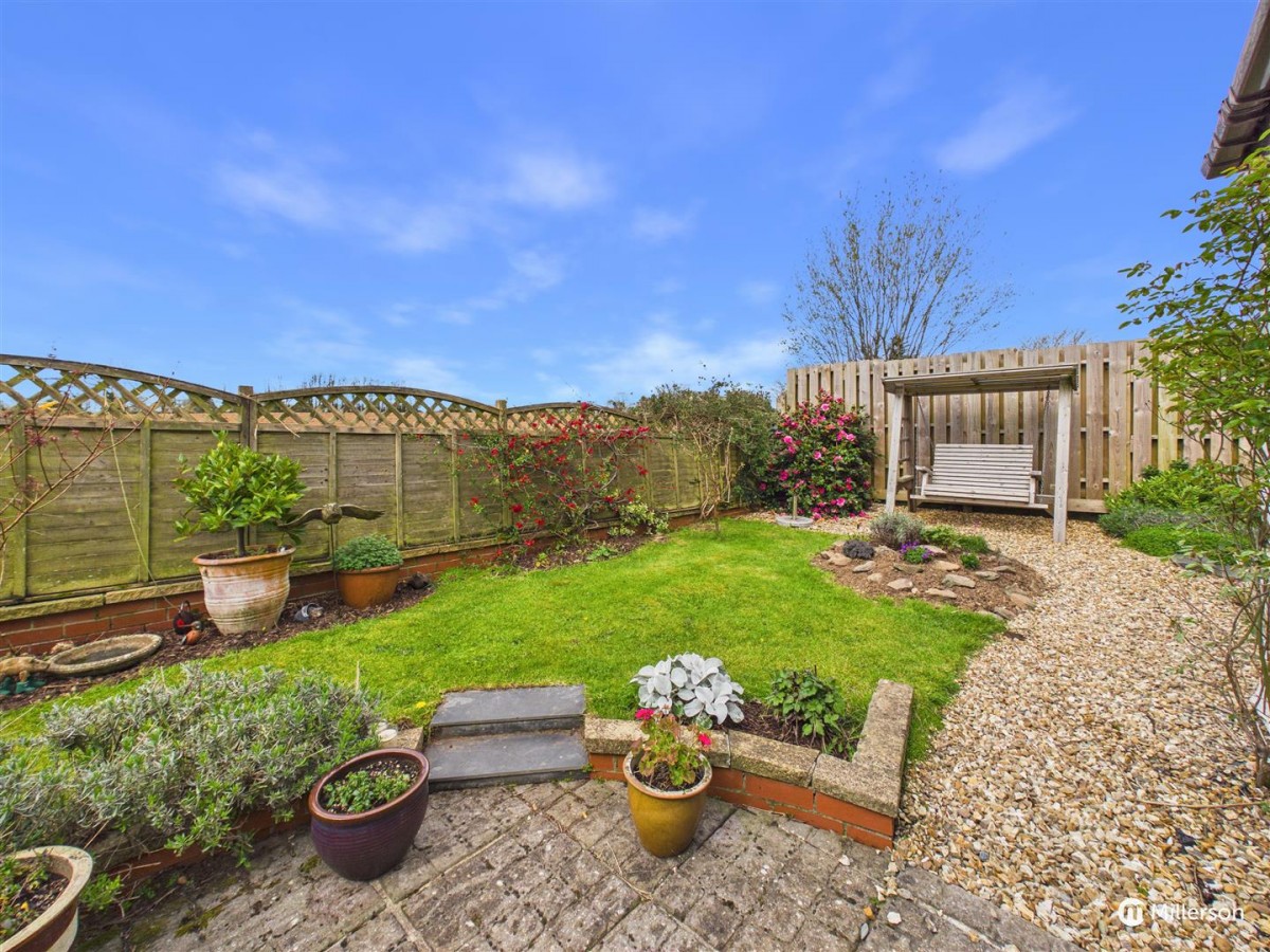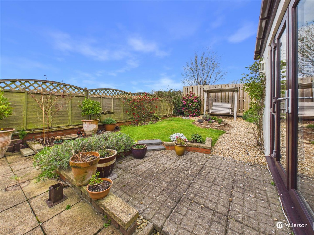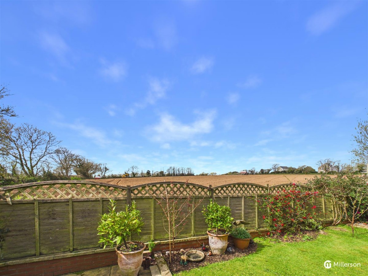 Enjoying a sunny aspect and attractively landscaped, laid mainly to lawn, gravel and paved patio. enclosed by fencing and enjoying views across the adjoining field.