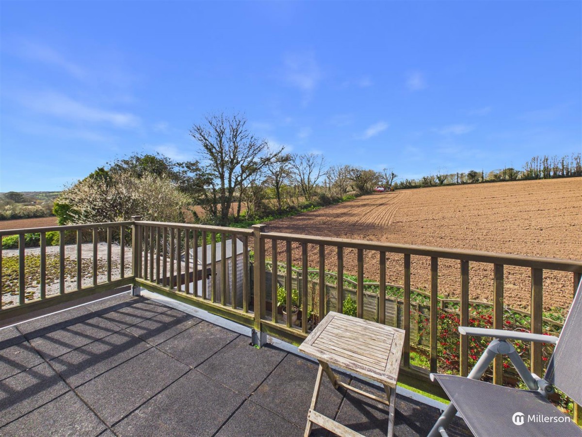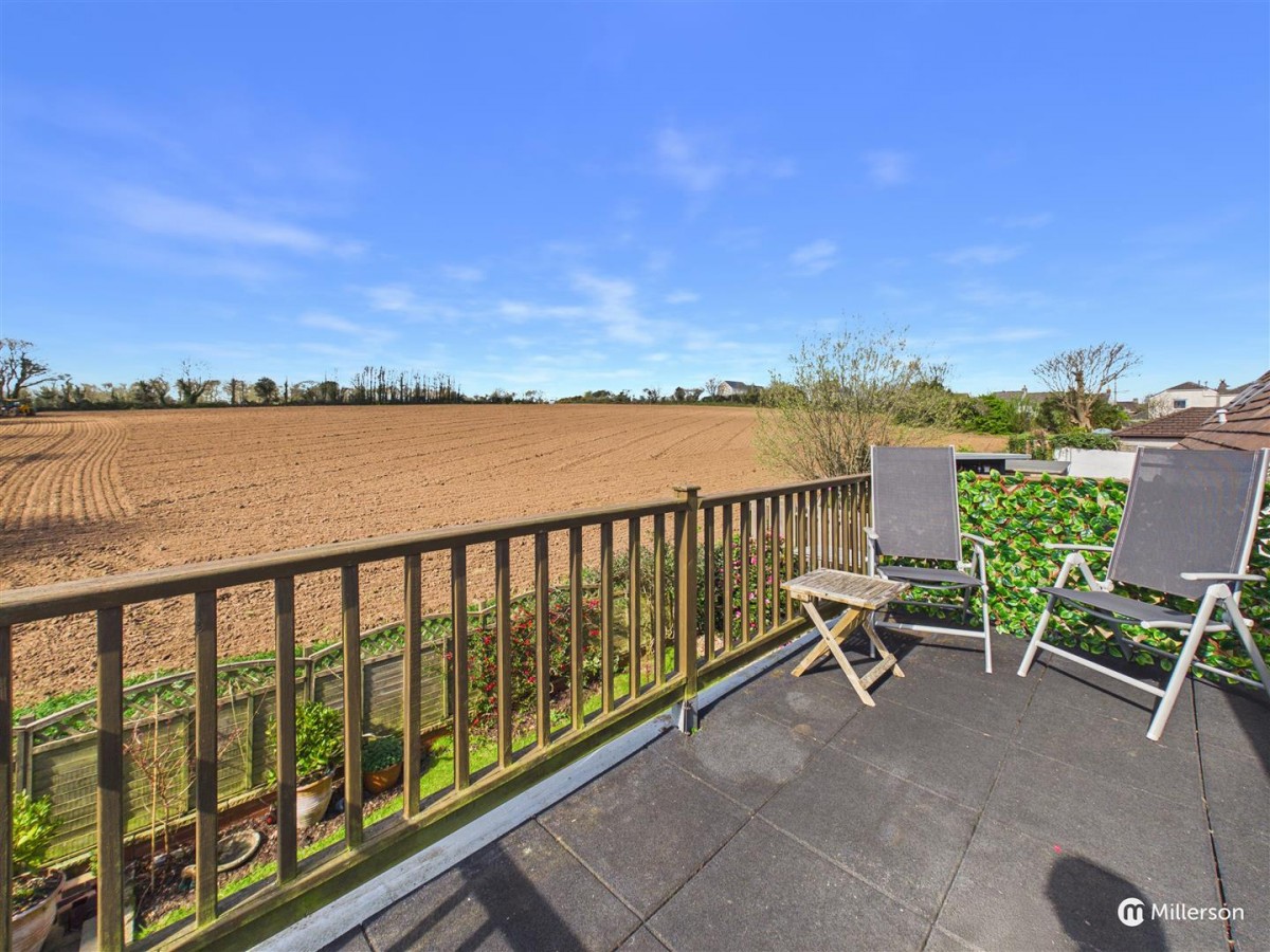 An enclosed balcony with space for table and chairs, enjoying rural views across an adjoining field.