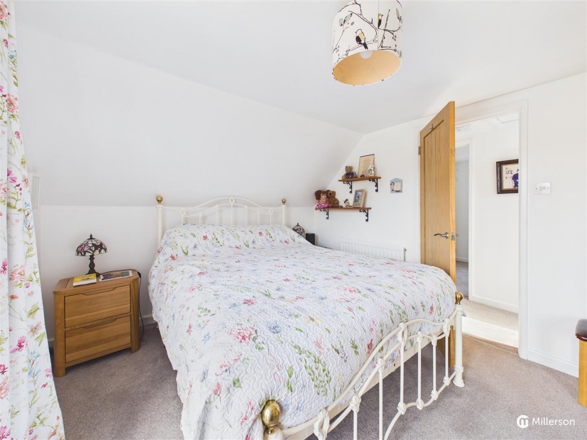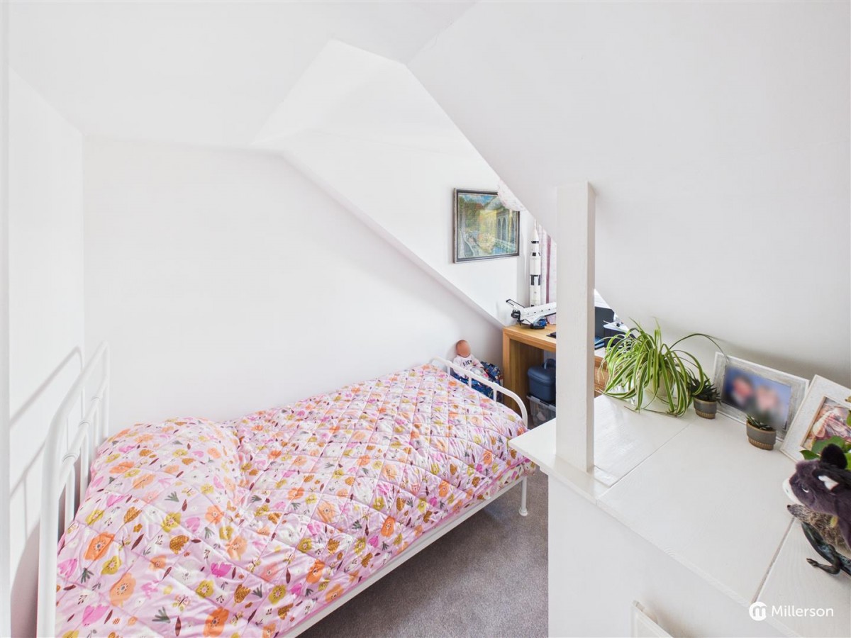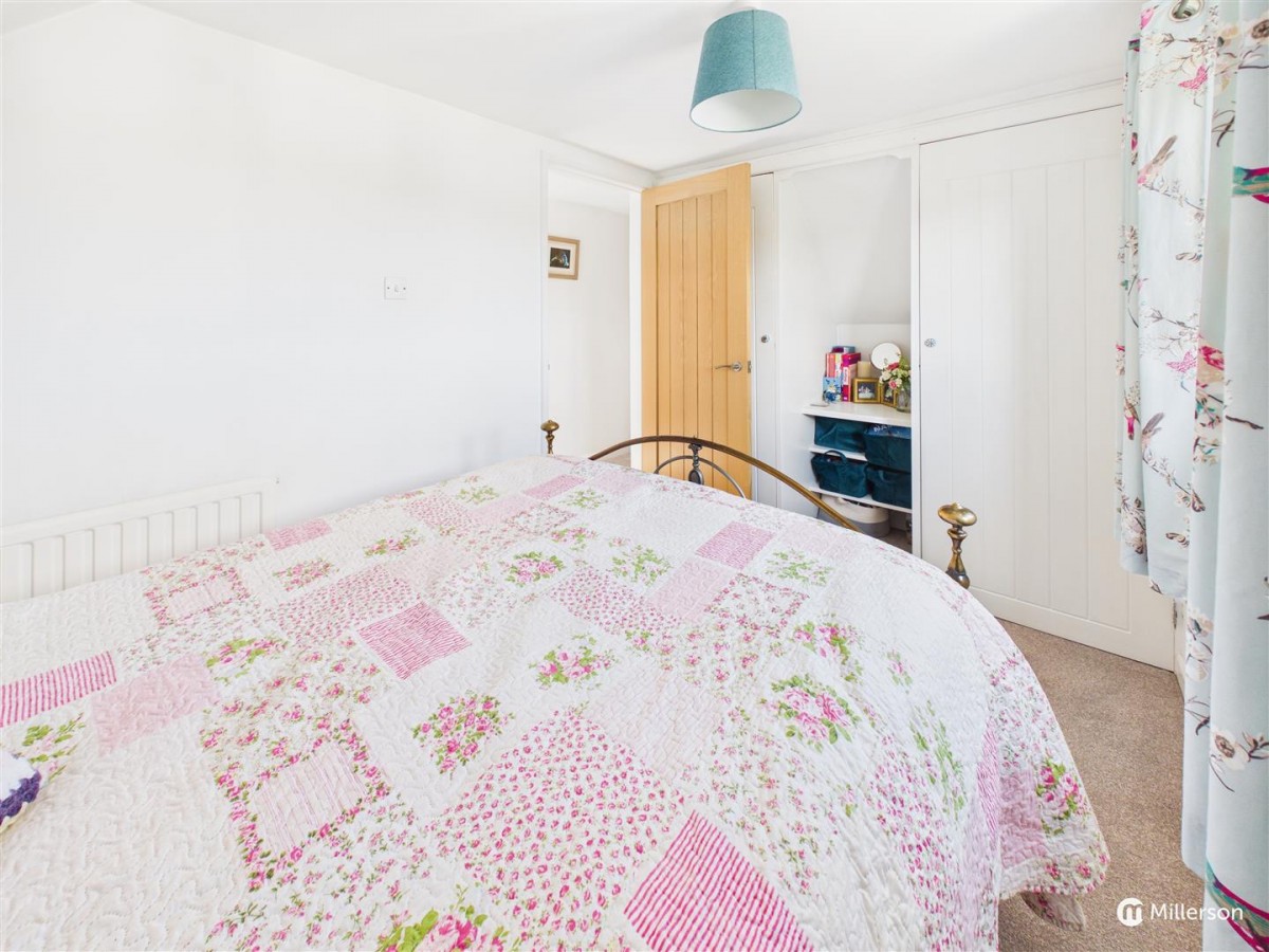 Fitted carpet, double glazed window to the front, sloping ceiling, radiator, two built in cupboards.