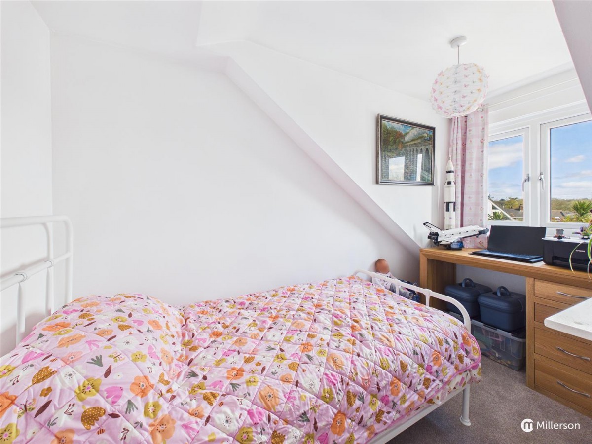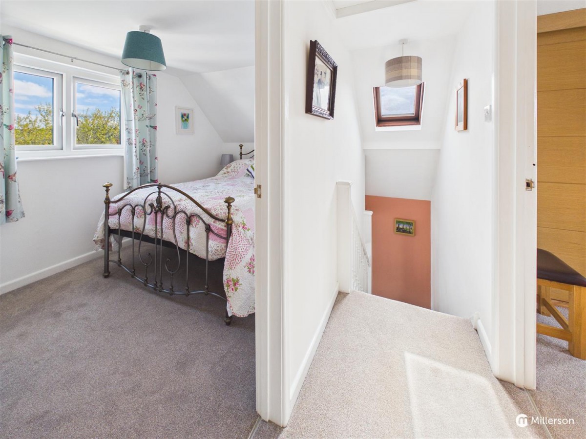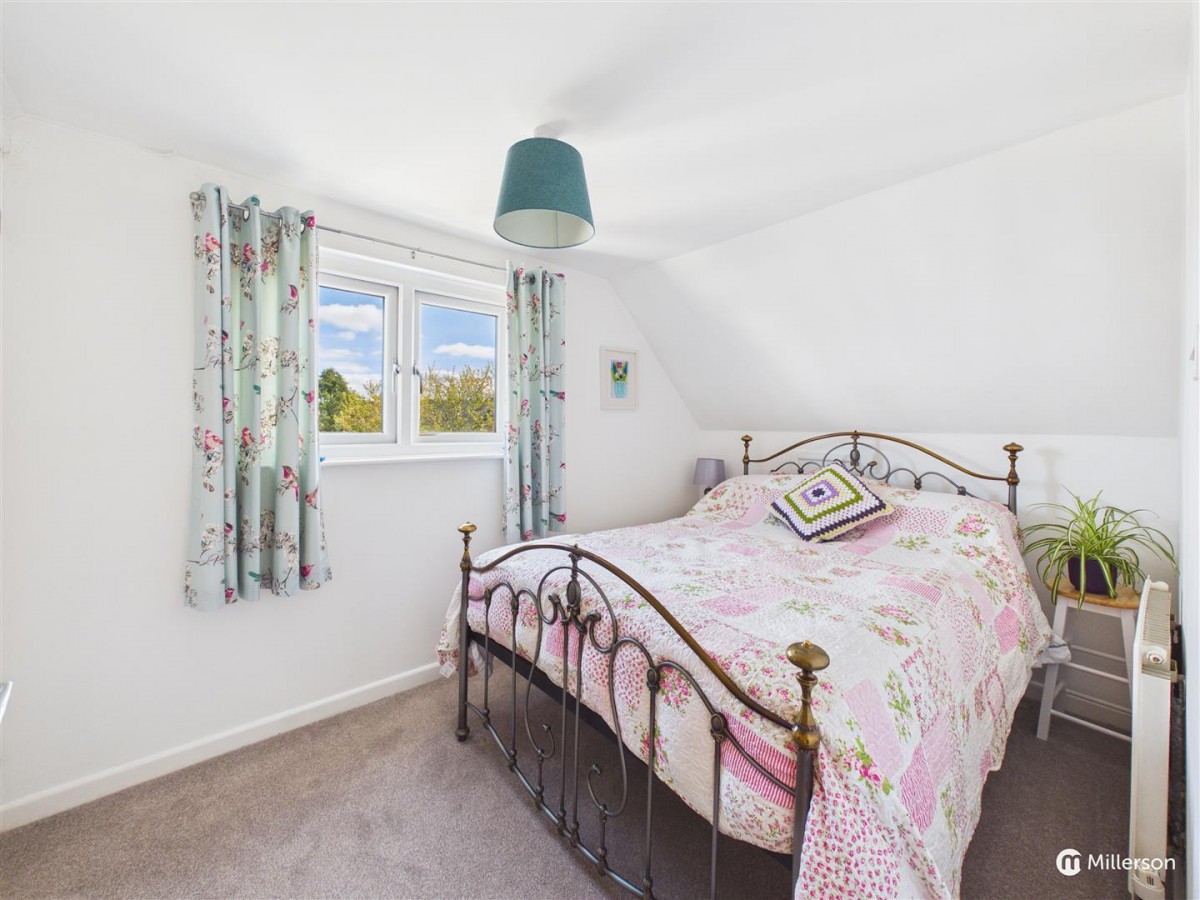 Fitted carpet, double glazed window to the front, sloping ceiling, radiator, two built in cupboards.