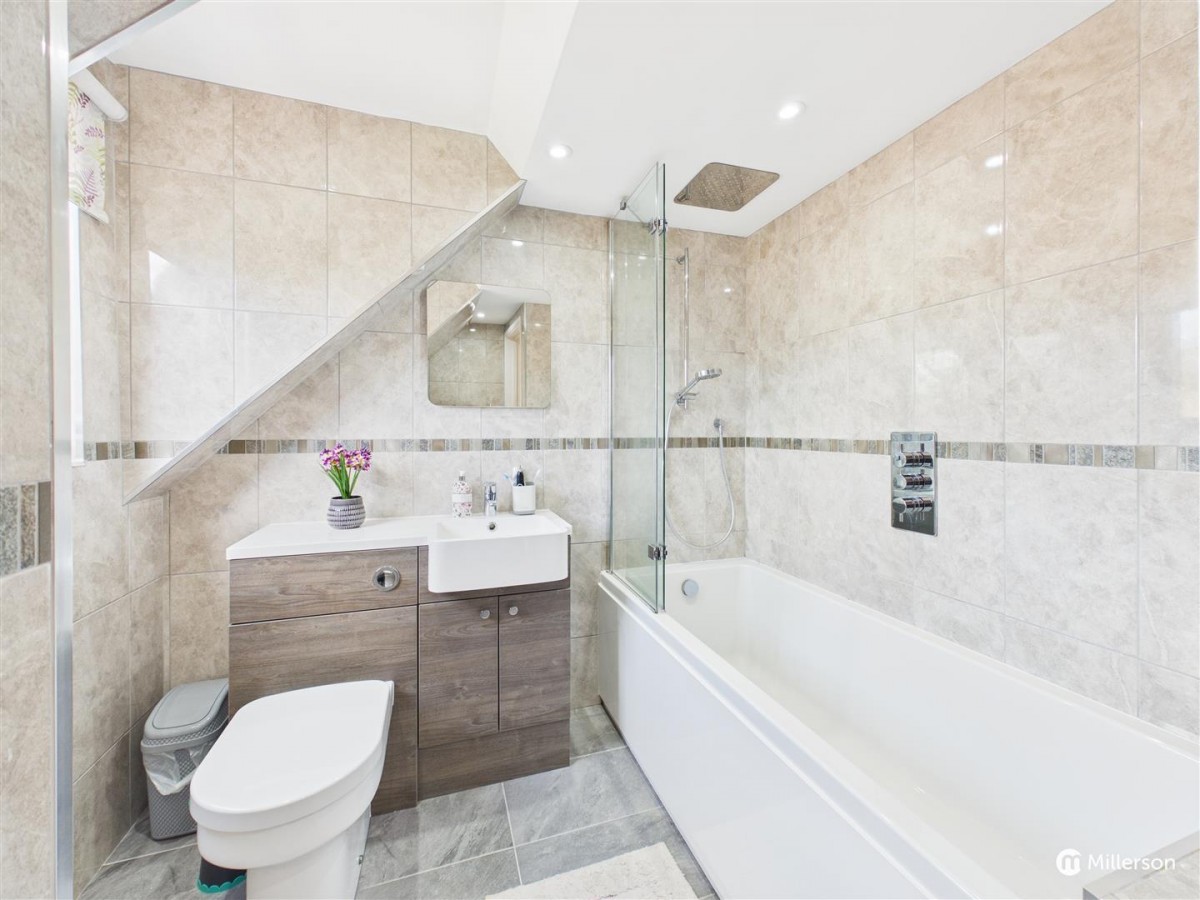 Attractively fitted with a modern white suite, comprising panel enclosed bath, tiled surround, mains fed shower with drencher head and hand attachment with wall mounted controls.