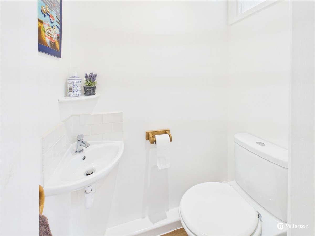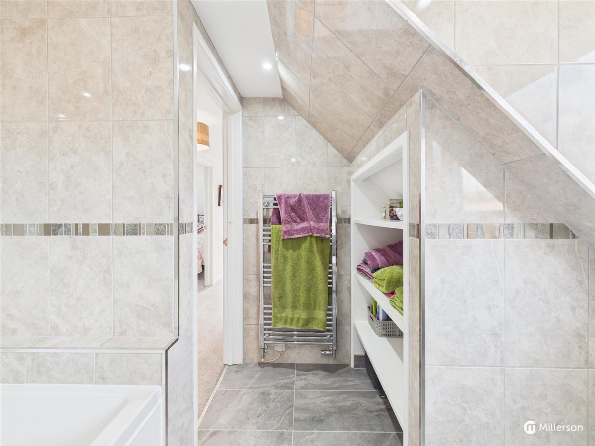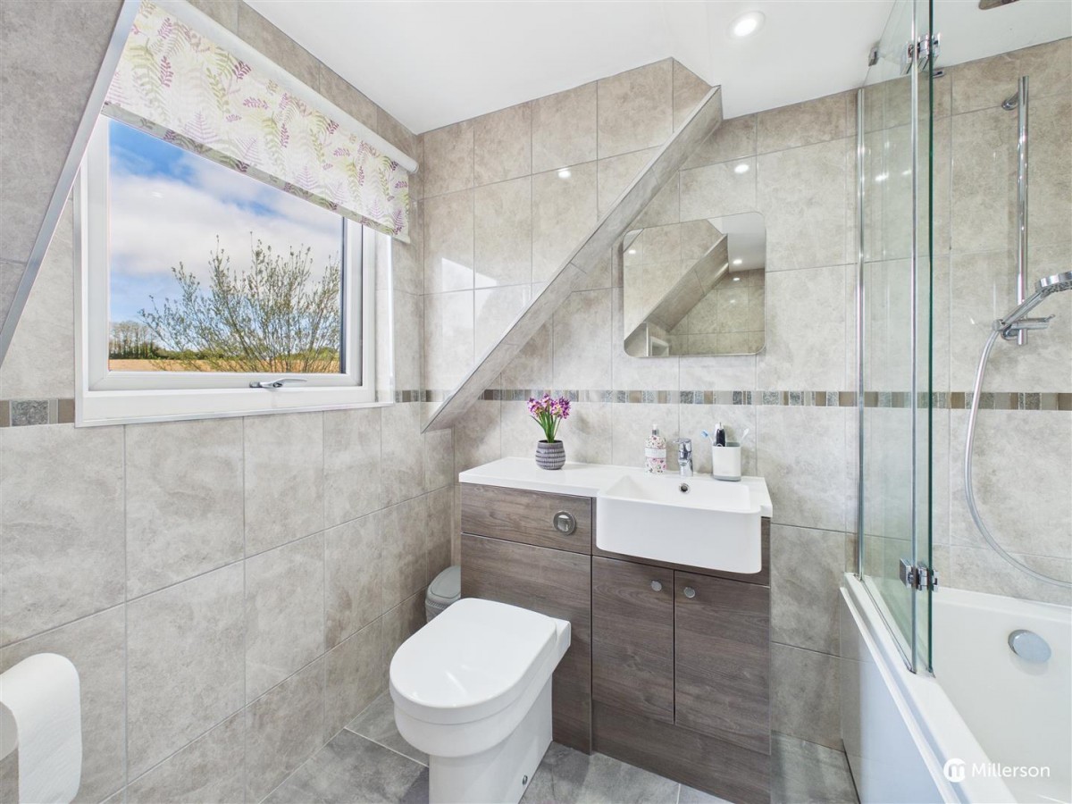Double glazed window to the rear, wash hand basin with monobloc tap, vanity unit below, low level w/c with push button flush, tiled flooring, sloping ceiling, heating radiator, recessed shelving. Inset ceiling lighting and extractor fan.