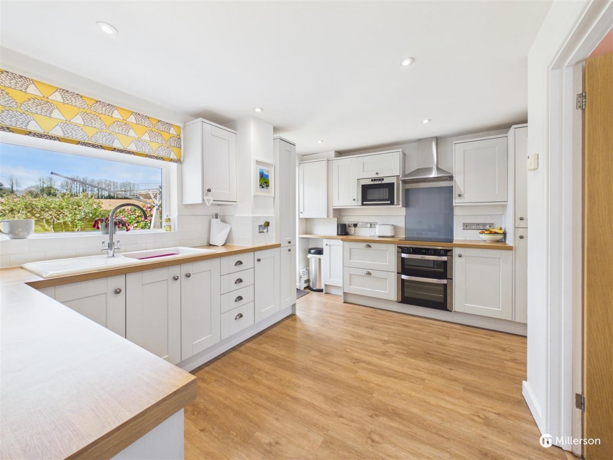Attractively fitted with a range of shaker style base and wall mounted kitchen units wood effect work surfacing over. Integrated fridge freezer, microwave oven, dishwasher, electric hob with stainless steel extractor above and double oven below.