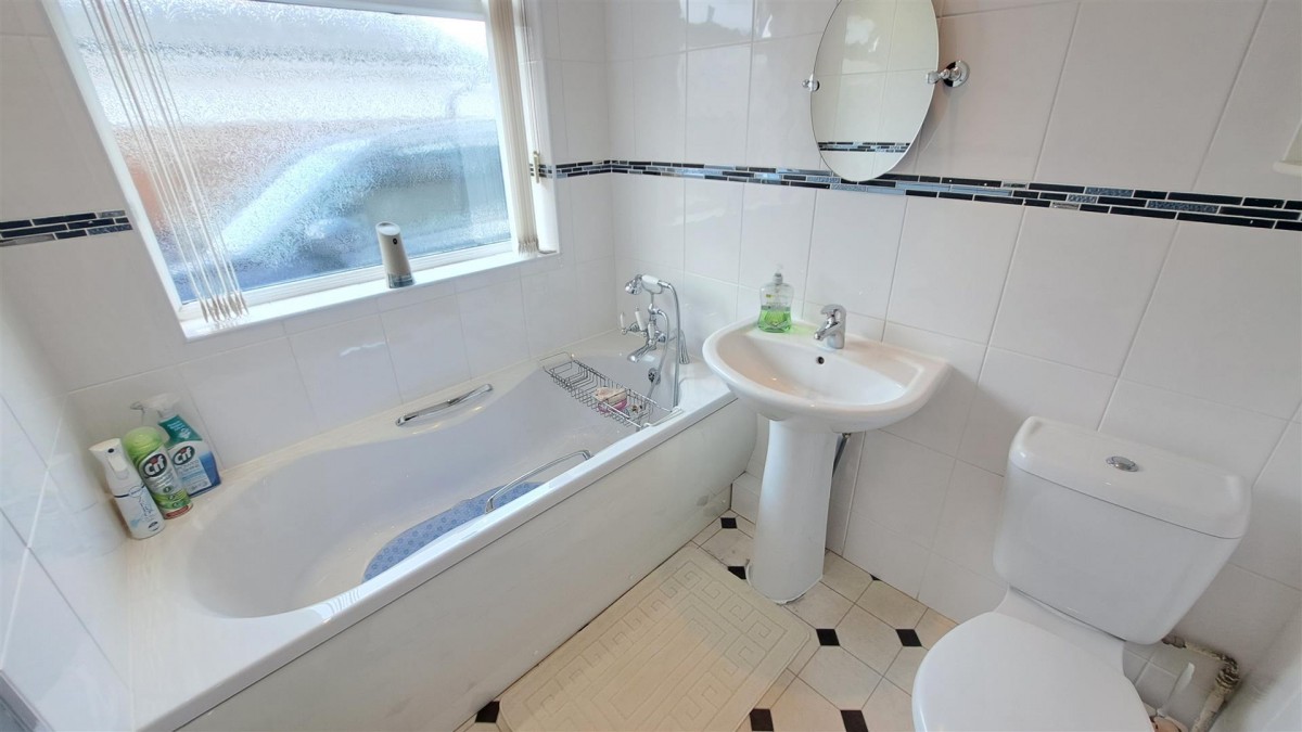 A white three piece bathroom suite comprising bath with vintage style shower attachment, W.C and hand basin, tiled walls, heated towel rail, tile effect flooring inset lighting, obscure double glazed window.