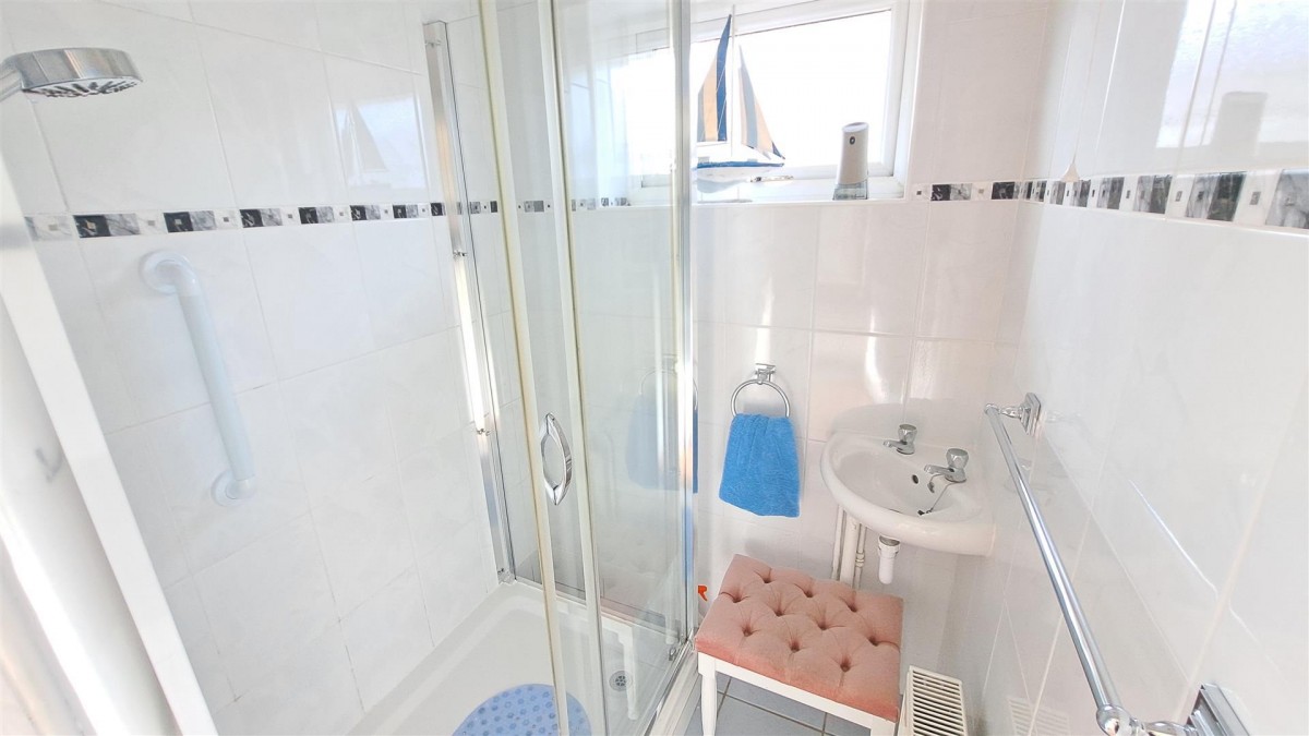 Previously a cloak room and now fitted with a shower cubicle and hand basin, tiled walls, tiled floor, radiator, extractor fan, obscure double glazed window.