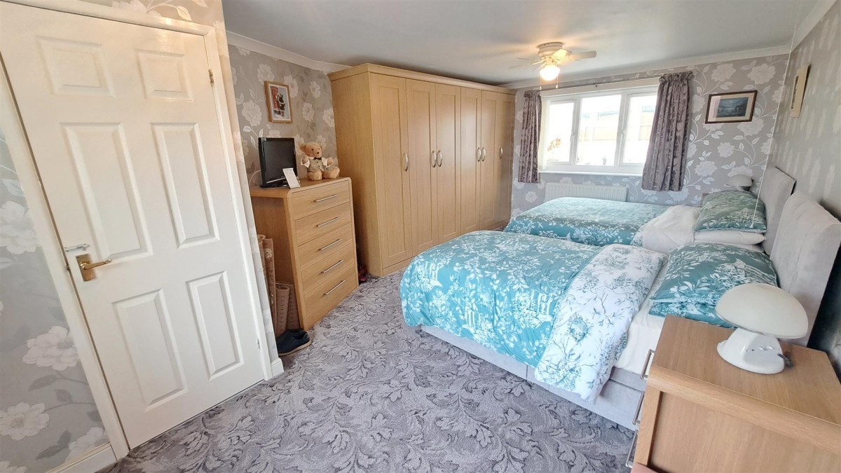 An impressive, dual aspect master bedroom with 6 door fitted wardrobes, double glazed windows to front and rear, radiator, additional built-in cupboard.