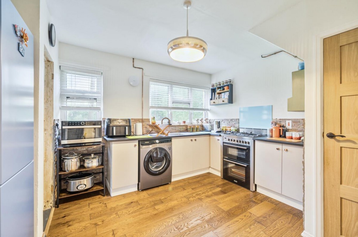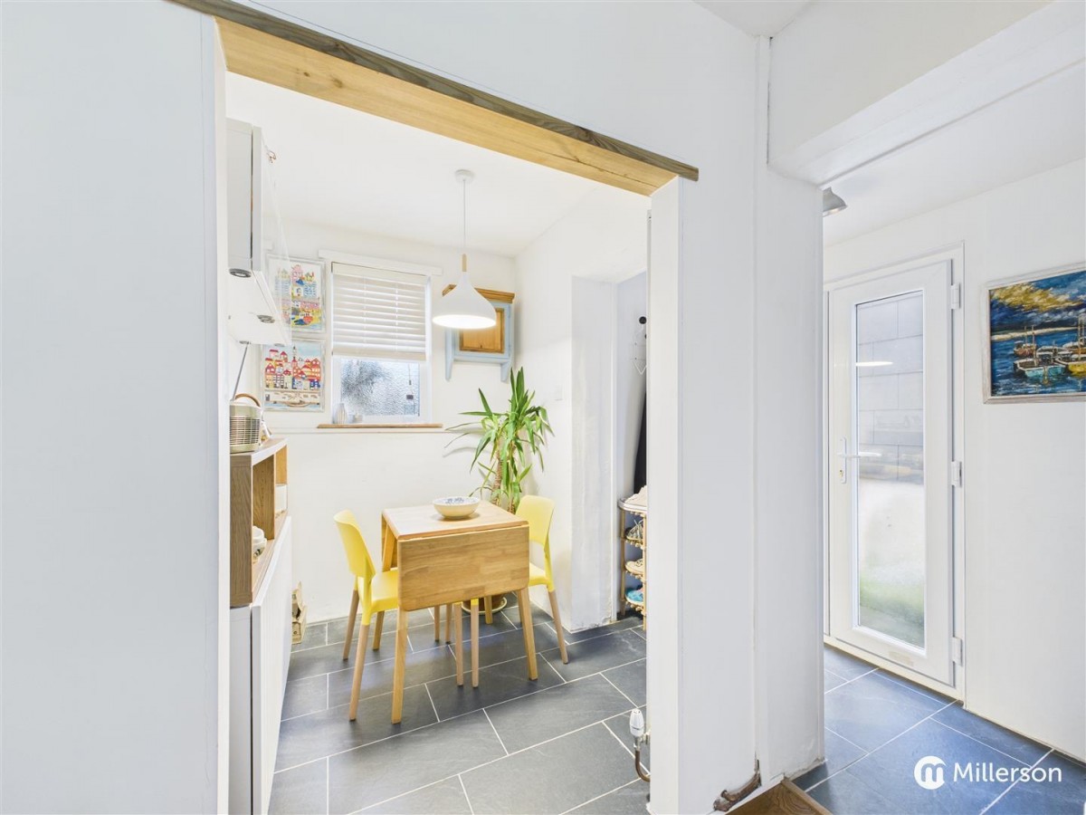 Continuation of the oak flooring and a newly fitted range of gloss base units, complemented by slate-effect composite worktops and tiled splashbacks. Four-ring gas hob with electric oven and grill, and extractor fan above. Two recessed areas, one currently used as a pantry and the other providing the perfect space for a large American-style fridge-freezer. Both are finished with the same beautiful tiles mirrored in the hallway. The kitchen also includes a one-bowl stainless steel sink with mixer tap, space and plumbing for a washing machine, and two double-glazed windows overlooking the rear garden. Double glazed doors open onto path providing rear access to the garden from the dining/breakfast area, which is laid with slate flooring and features an upright radiator, an opaque-glass window to the front, and houses the gas boiler (installed four years ago and serviced annually). An oak door opens to a useful understairs storage area, currently used by the vendors to house condenser tumble dryer.