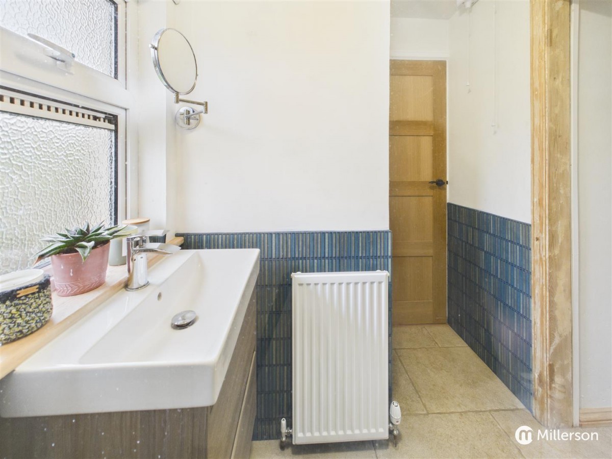 Walk-in shower with level-access slate-effect tray and low-maintenance composite splash-backs. The boiler-fed shower is fitted with both a waterfall head and additional attachment. Large basin with storage below and mixer tap above all finished with beautiful half-height tiling. Opaque UPVC double-glazed window provides natural light and a handy recessed area offers the perfect spot for storage.