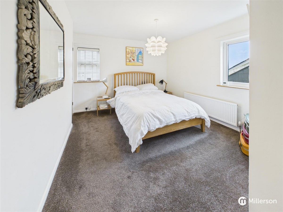 A spacious room with ample space for a king-size bed alongside additional furniture.  Benefitting from a recessed built-in wardrobe and two UPVC double-glazed windows looking out to the side and the front. Carpeted flooring and radiator.