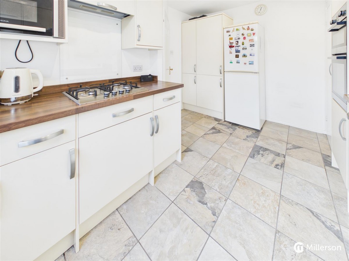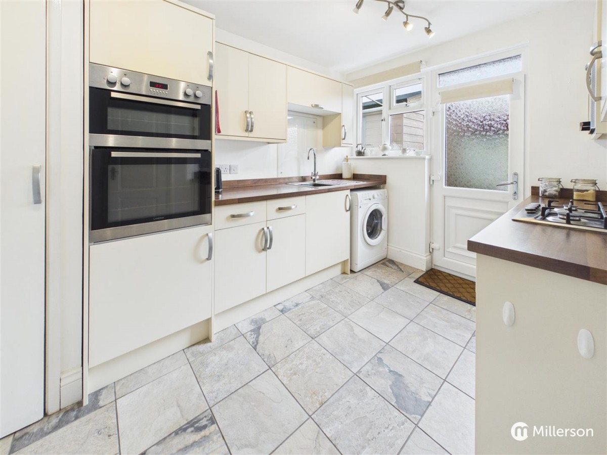 A range of matching base and wall units with wood effect work surfaces and and matching upstands, integrated stainless steel sink, oven, gas hob, extractor and microwave, spaces for washing machine and fridge/freezer, cupboard housing combination boiler, tiled flooring, double glazed window and obscure double glazed door to rear garden.
