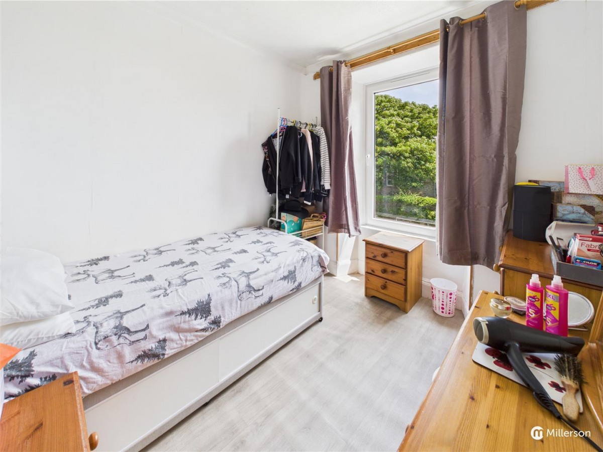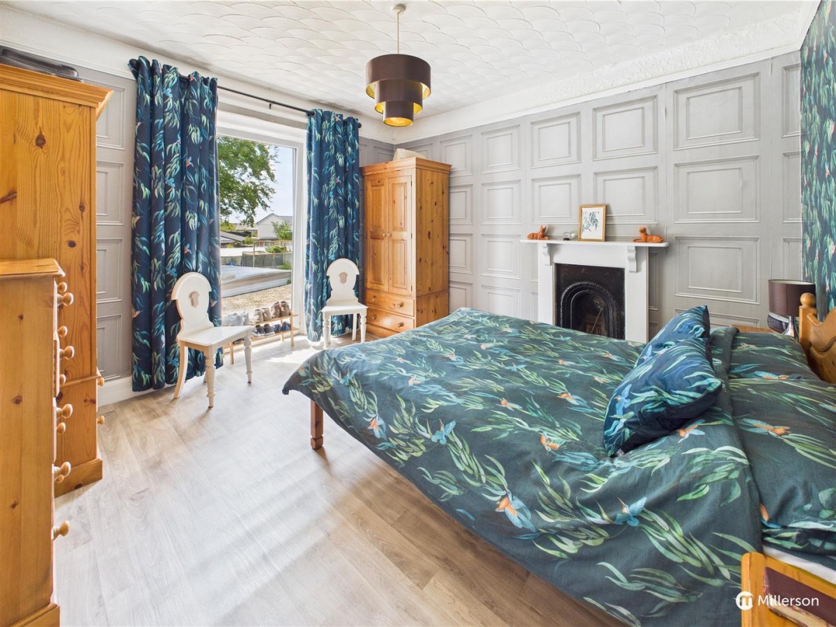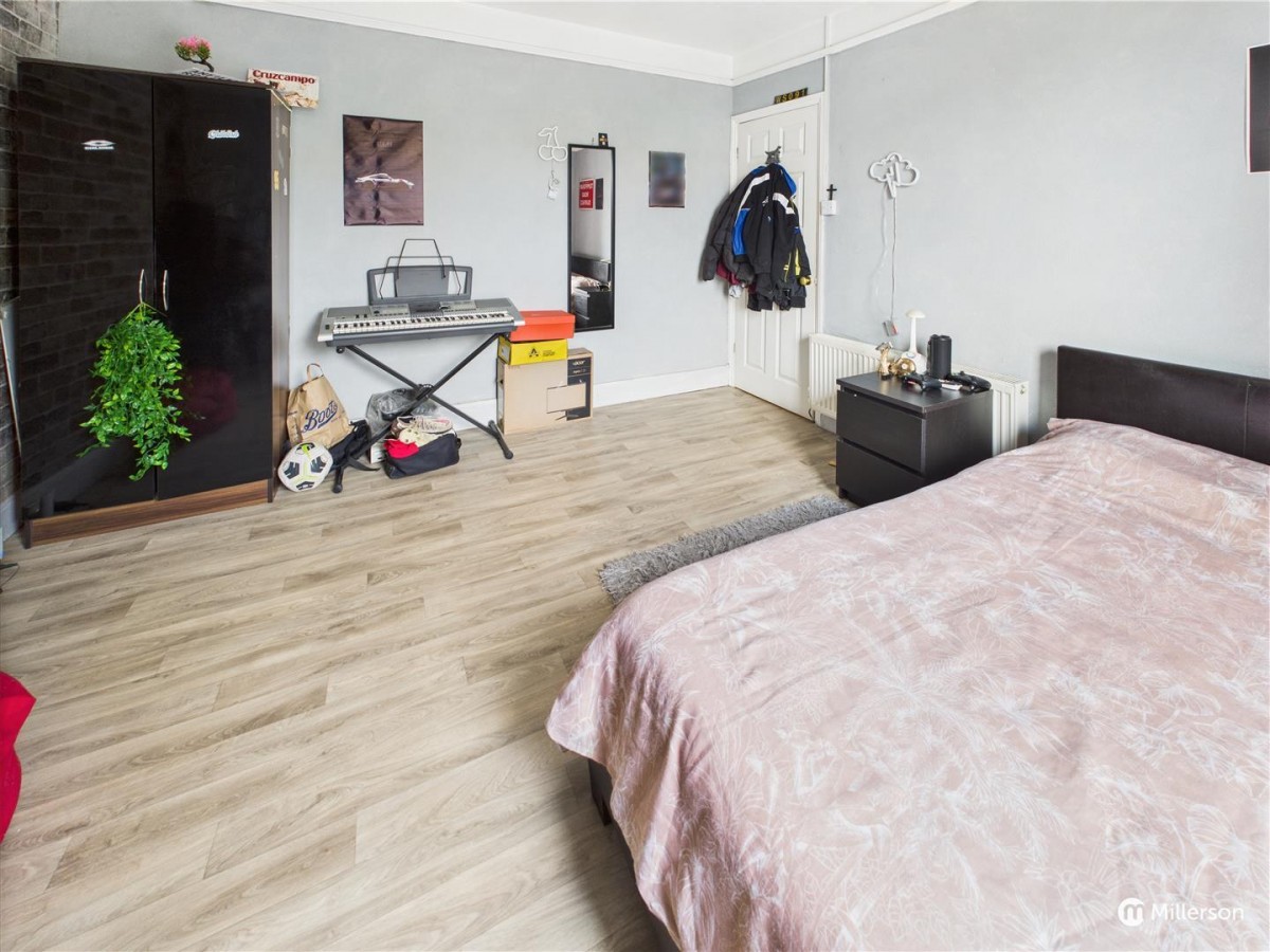 A second double bedroom with large floor to ceiling double glazed window, original feature fireplace, radiator, wood effect flooring, loft access hatch.