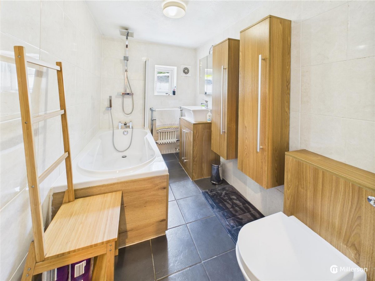 A white three piece bathroom suite comprising bath with water fall style shower head and two additional shower attachments, hand basin with fitted cupboard below, and W.C, two large fitted cupboards, vintage style radiator with towel rail, tiled walls, tiled floor, obscure double glazed window, extractor fan.