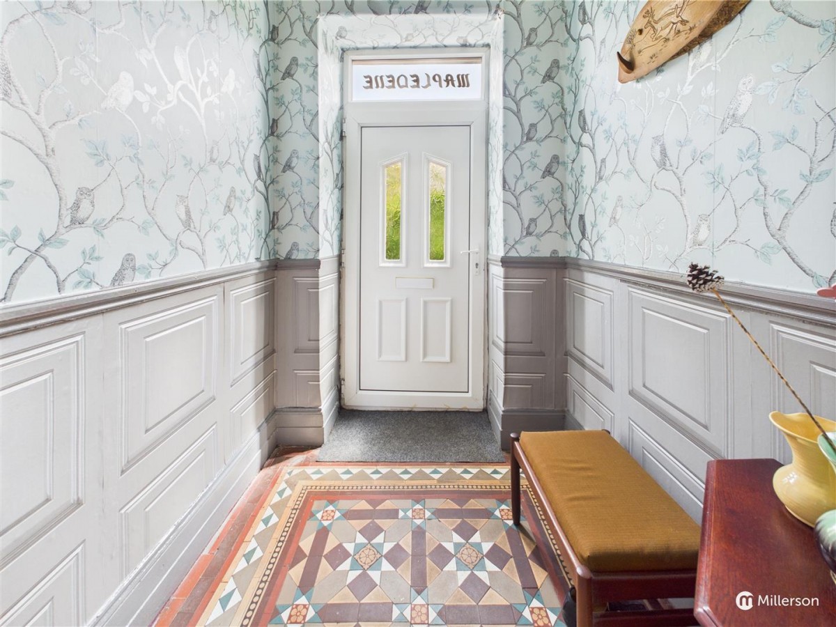 Original tiled flooring, decorative cornice and ceiling rose, glazed door into: