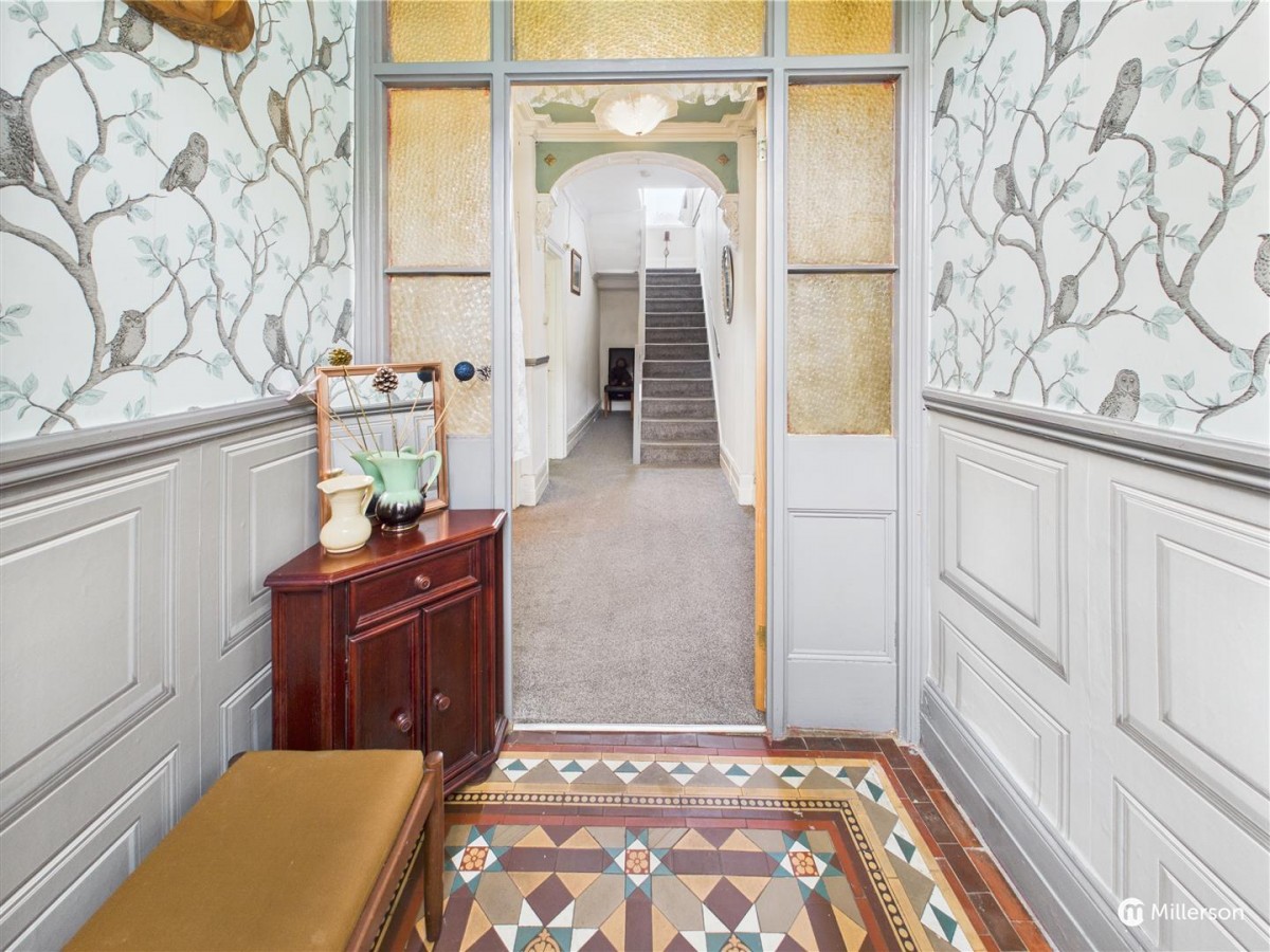 Original decorative archway and architraves, stairs to first floor with storage space below, radiator, doors to living room and sitting room.