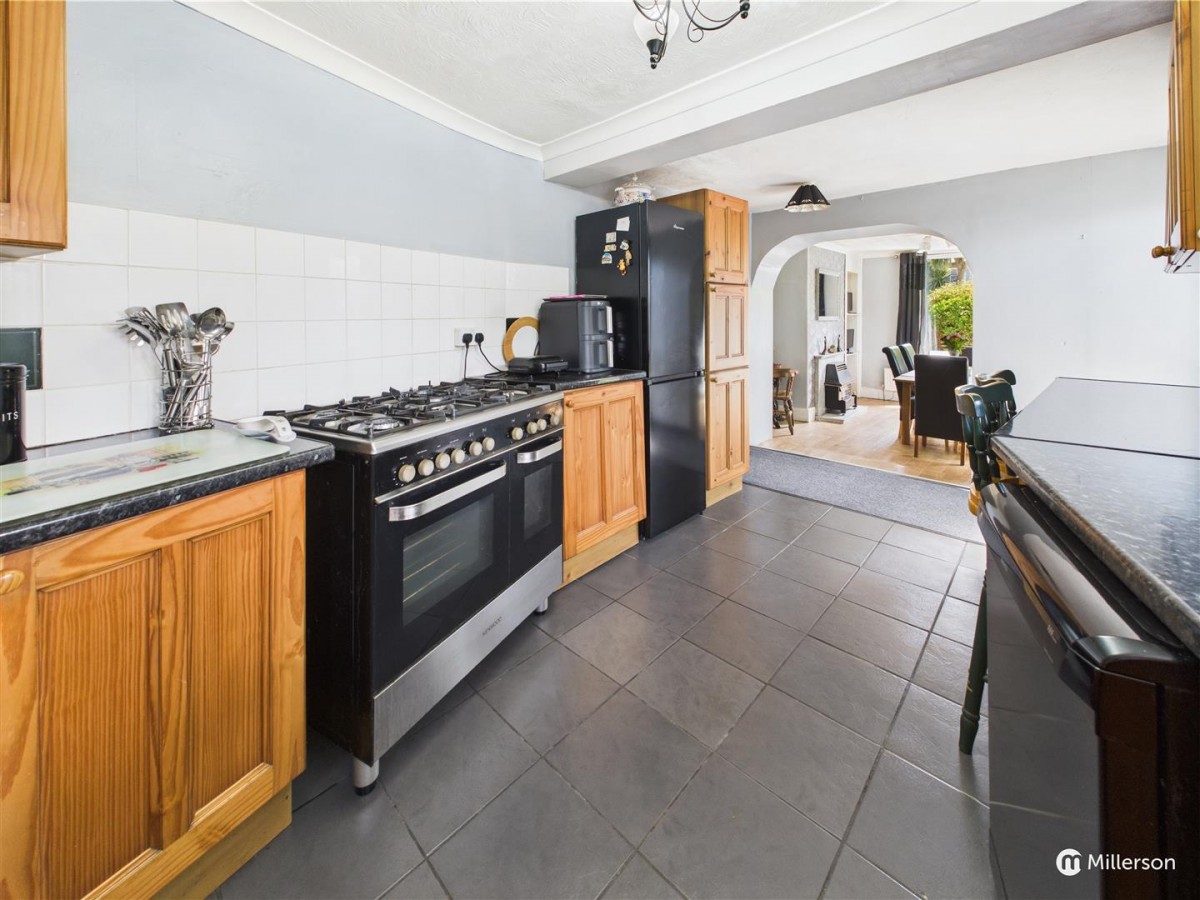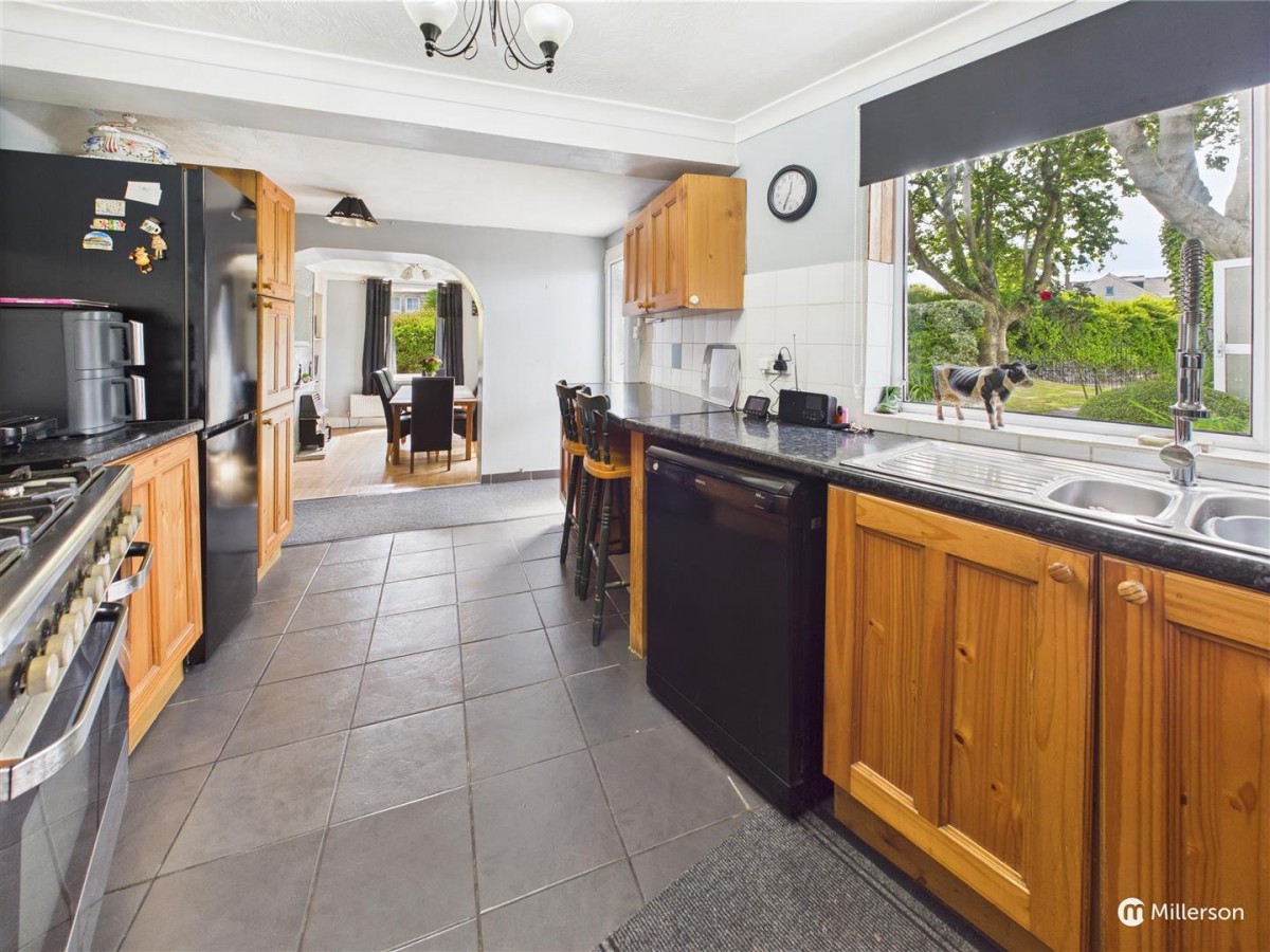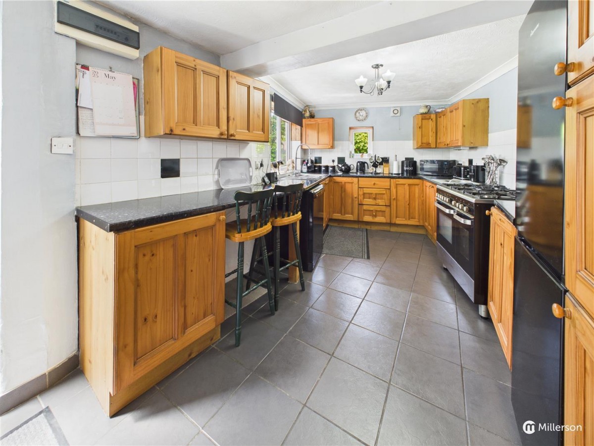 Fitted with a range of matching wooden base and wall units with granite effect work surfaces and tiled splash backs, one and half bowl stainless steel sink with mixer tap and drainer, breakfast bar, spaces for large range style cooker, fridge/freezer and dishwasher, slate effect tiled flooring, dual aspect doble glazed windows and obscure double glazed door to garden.