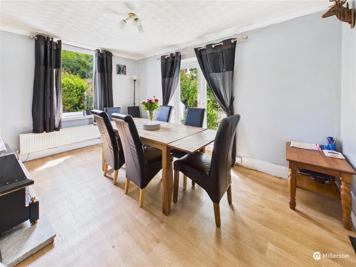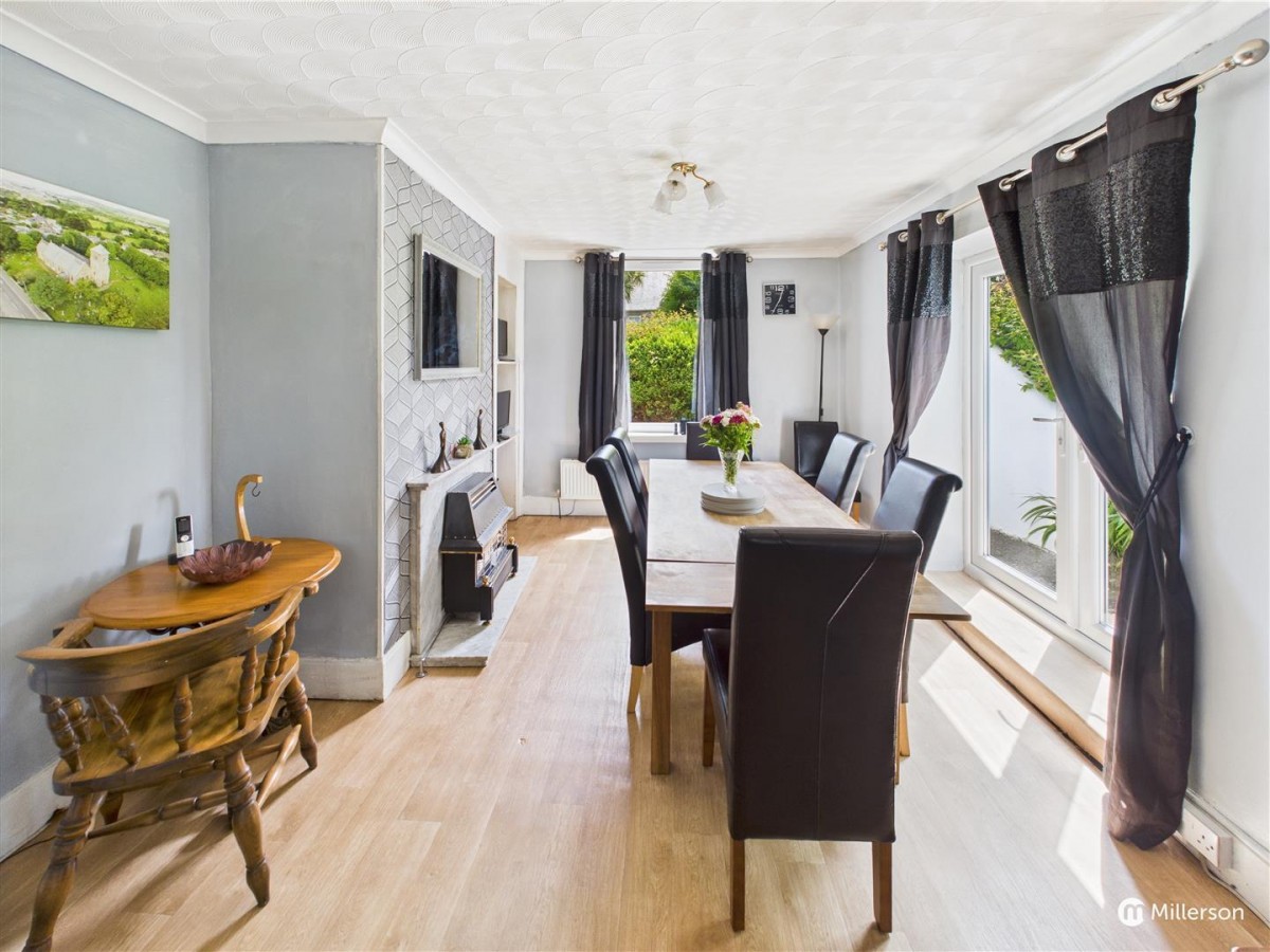 A dual aspect dining room with plenty of space for a large table and chairs, double glazed window and patio doors to garden, feature fireplace, built in storage cupboard, wood effect flooring, archway into: