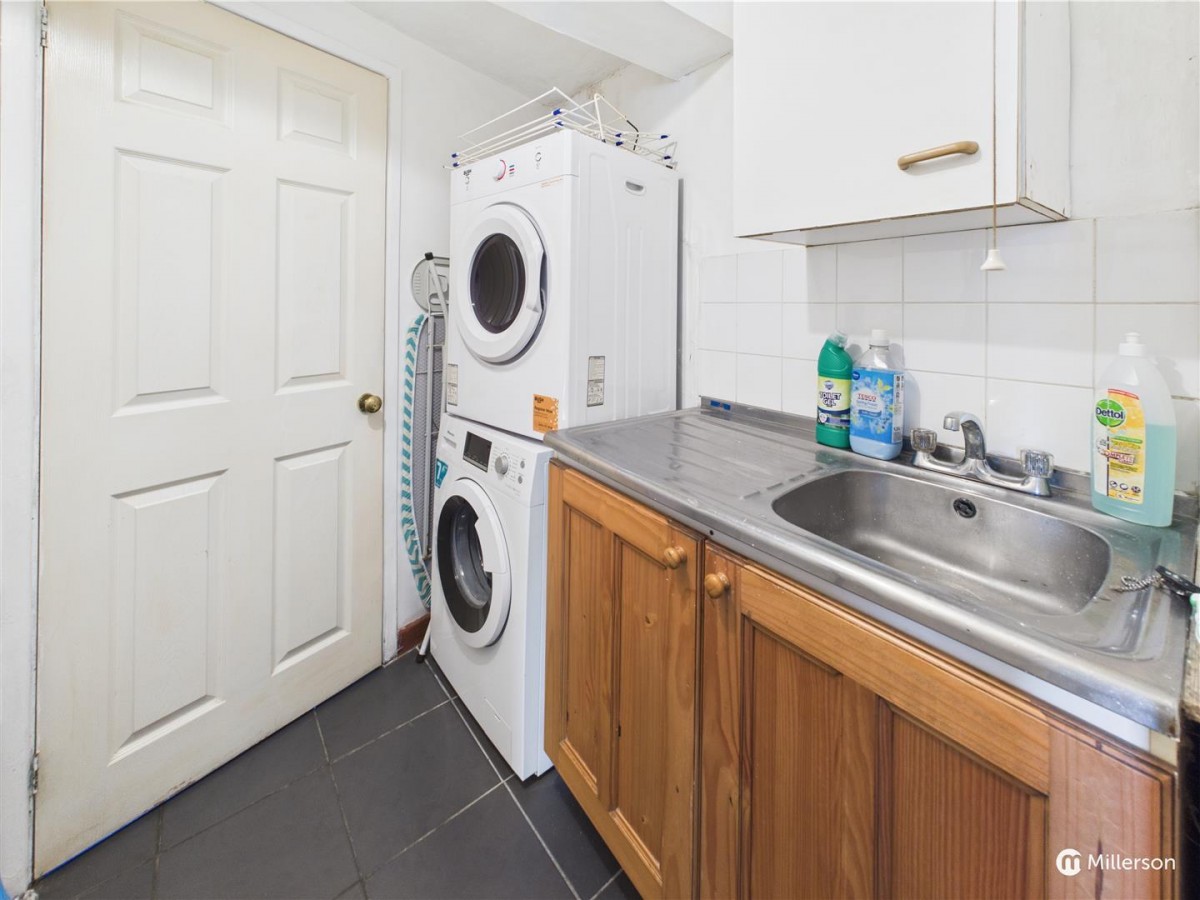 a useful utility area with space and plumbing for washing machine, stainless steel sink with tiled splash back and fitted cupboard above and below, slate effect tiled flooring, door into: