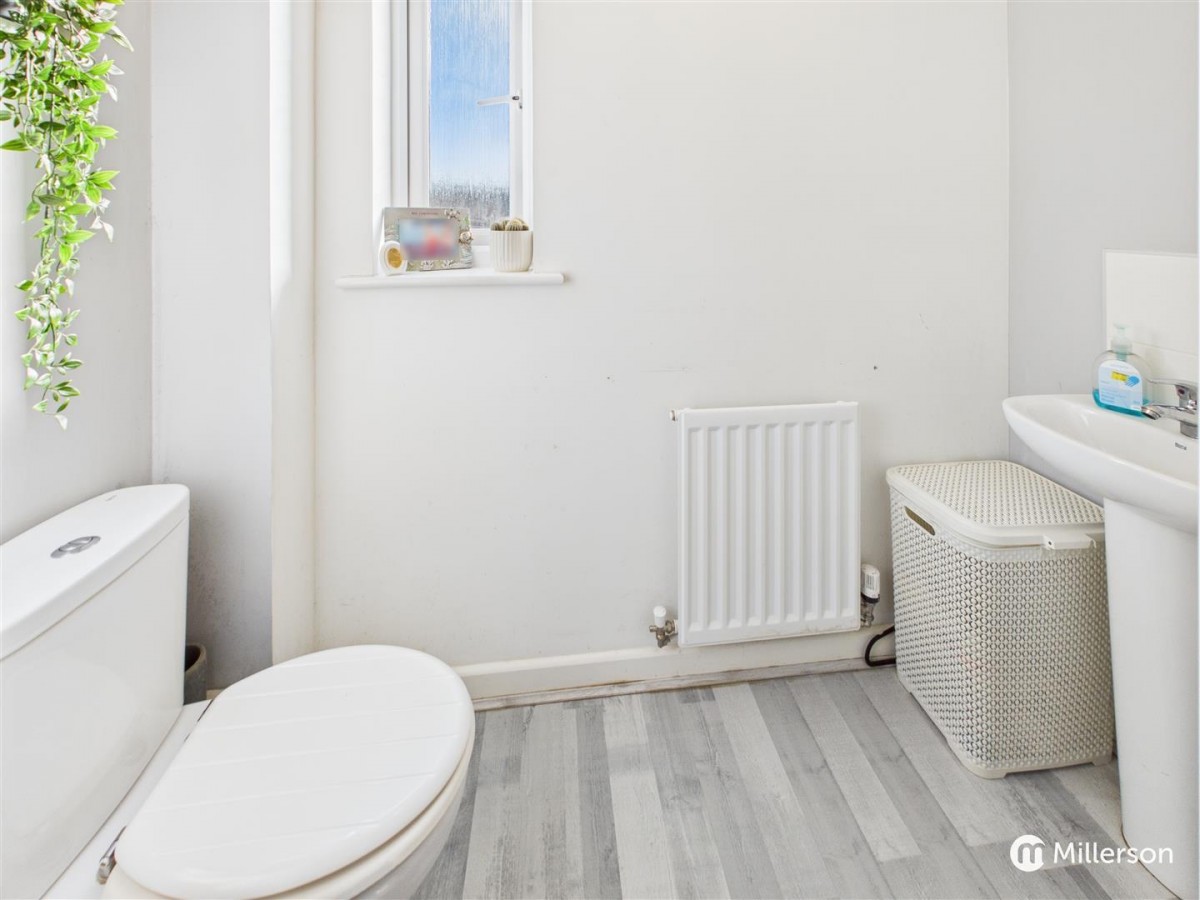 W.C and hand basin with tiled splash back, wood effect flooring, radiator, obscure double glazed window.