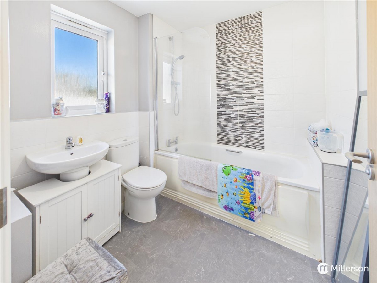 A white three piece bathroom suite comprising bath with shower over and tiled surround, W.C and hand basin with tiled splash back, radiator, tile effect flooring, obscure double glazed window, extractor fan.