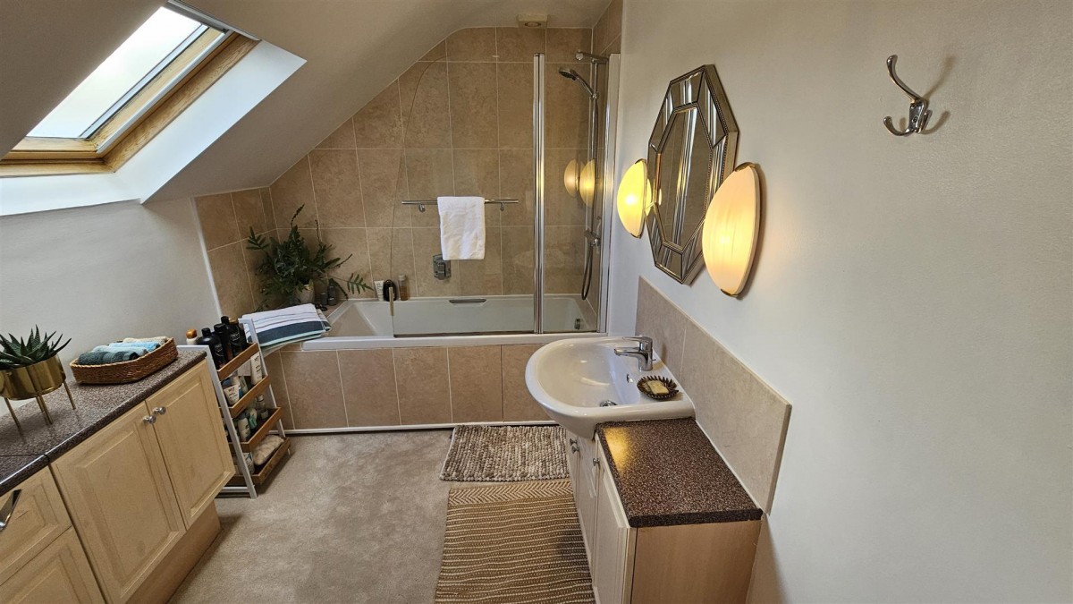 Fitted carpets, panel enclosed bath with mains fed shower over, tiled surround, inset ceiling spot lights and extractor fan, wash hand basin with monobloc tap, and vanity unit below,