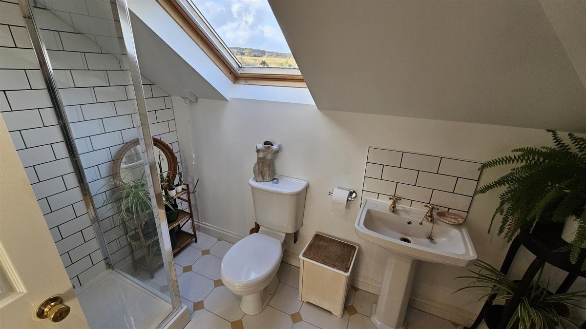 Shower cubicle with electric shower, tiled surround, glass door, inset ceiling spot lights, low level w/c, pedestal wash hand basin sloping ceiling with Velux roof window, tiled flooring, radiator.