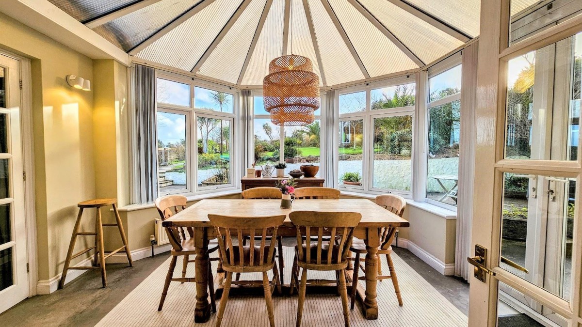 Double glazed windows to four sides enjoying views across the rear south-facing garden, vinyl flooring, sloping polycarbonate roof, double glazed doors to the side and double doors leading into...